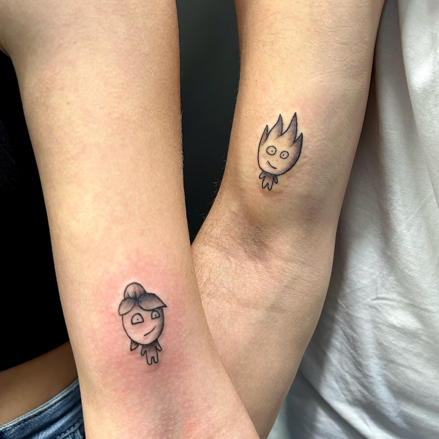 This charming image showcases two playful tattoos, each depicting a whimsical character that represents the bond between siblings. The unique designs reflect their personalities, making the tattoos a delightful reminder of their connection. For those considering matching tattoos, choosing designs that symbolize shared interests can make the experience even more meaningful.