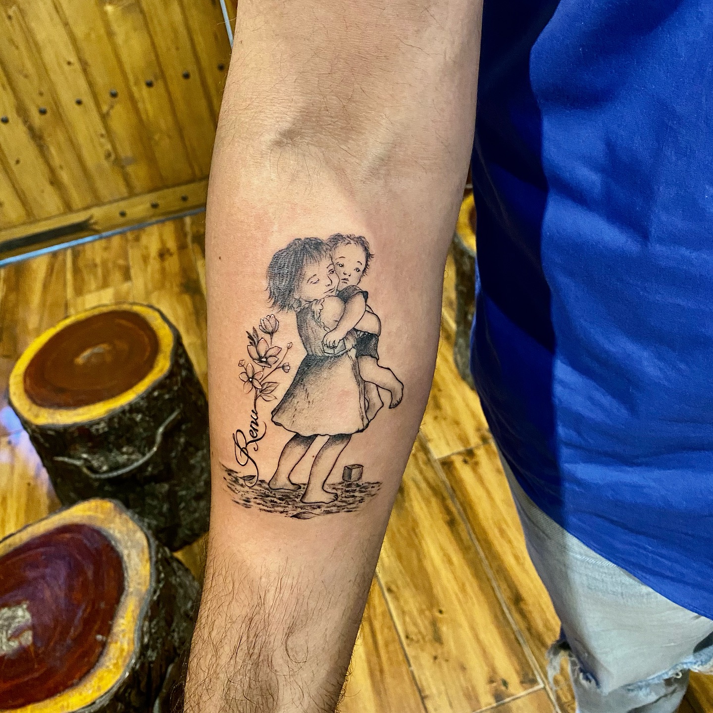 This tattoo beautifully captures the bond between a brother and sister, showcasing a tender moment that many can relate to. The delicate details, like the flowers and the playful expressions, evoke a sense of nostalgia for carefree childhood days. Choosing a tattoo that represents such cherished memories can be a meaningful way to honor sibling relationships.