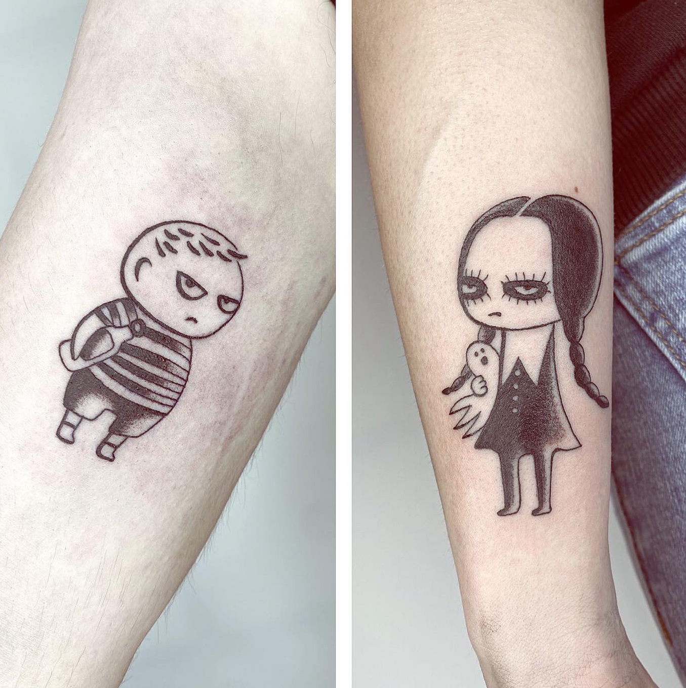 This image showcases two playful tattoos that perfectly capture the bond between siblings. One features a mischievous boy with a playful expression, while the other depicts a girl with a ghost doll, showcasing their unique personalities. For siblings looking to express their connection, choosing designs that reflect shared memories or favorite characters can be a fun way to celebrate their relationship.