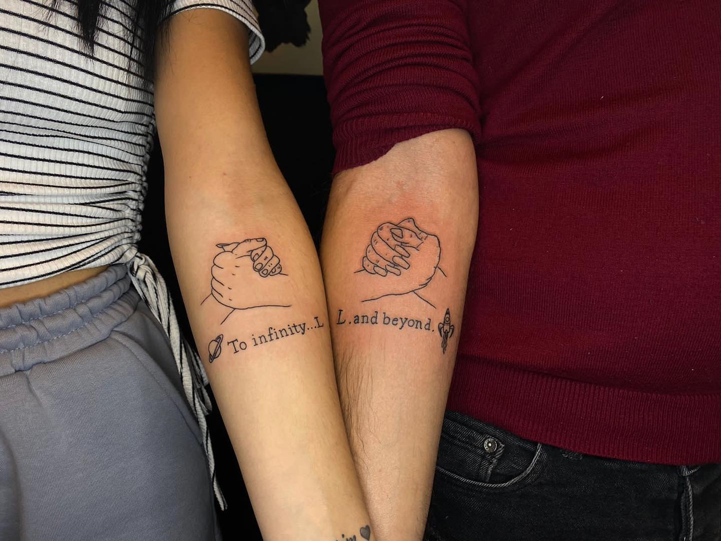 In this striking image, two hands are clasped together, symbolizing a deep connection between siblings. The words âTo infinity… L and beyondâ beautifully express their endless love for each other. Tattoos like these can be a meaningful way to celebrate the unique bond between a brother and sister, reminding them of their shared journeys and adventures.