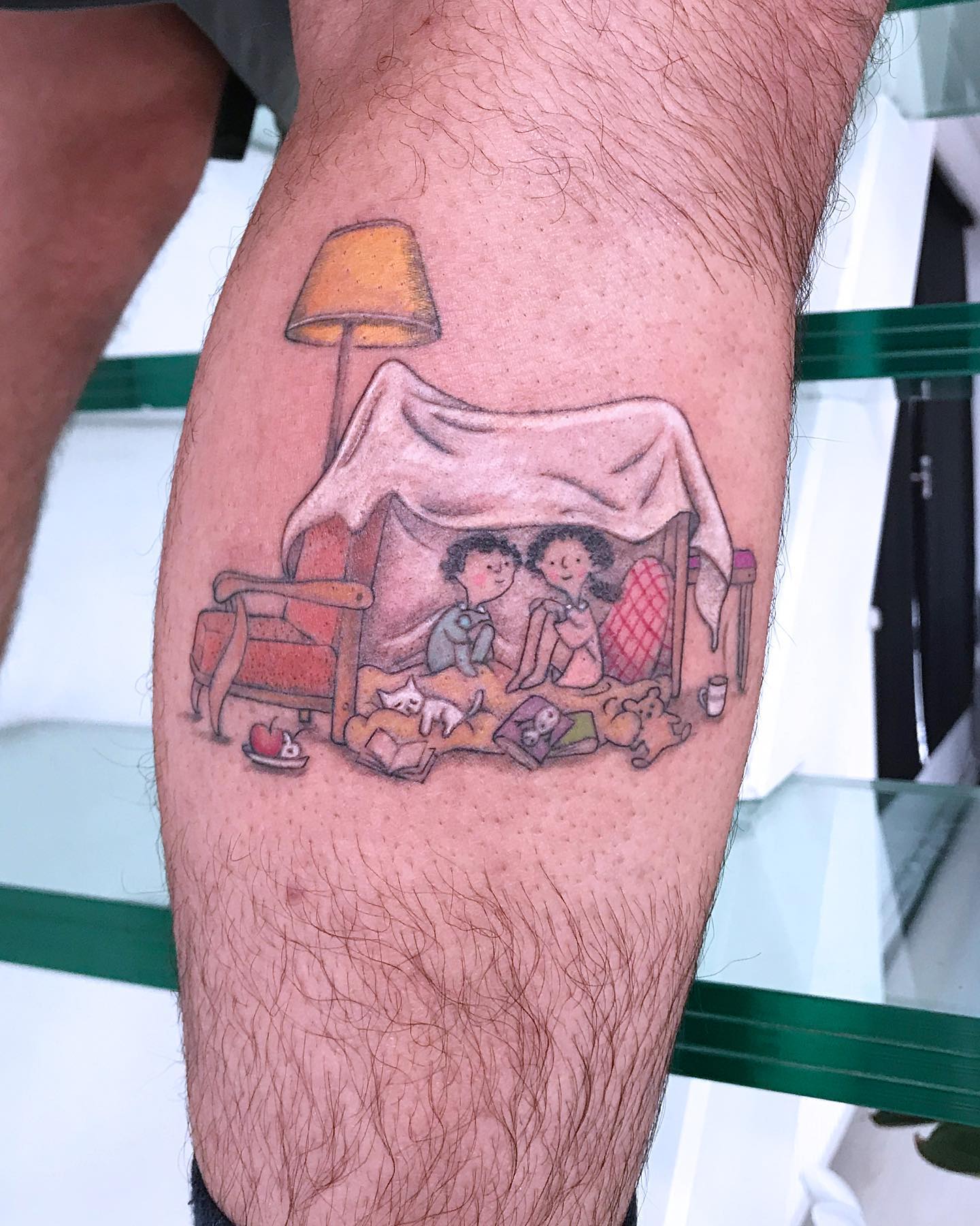 This delightful tattoo captures a cozy scene of two siblings sharing a fort, complete with a glowing lamp and playful pets. It beautifully symbolizes the bond between brothers and sisters, reminding viewers of the magic of childhood adventures. Choosing a design that reflects shared memories can make a tattoo even more special.