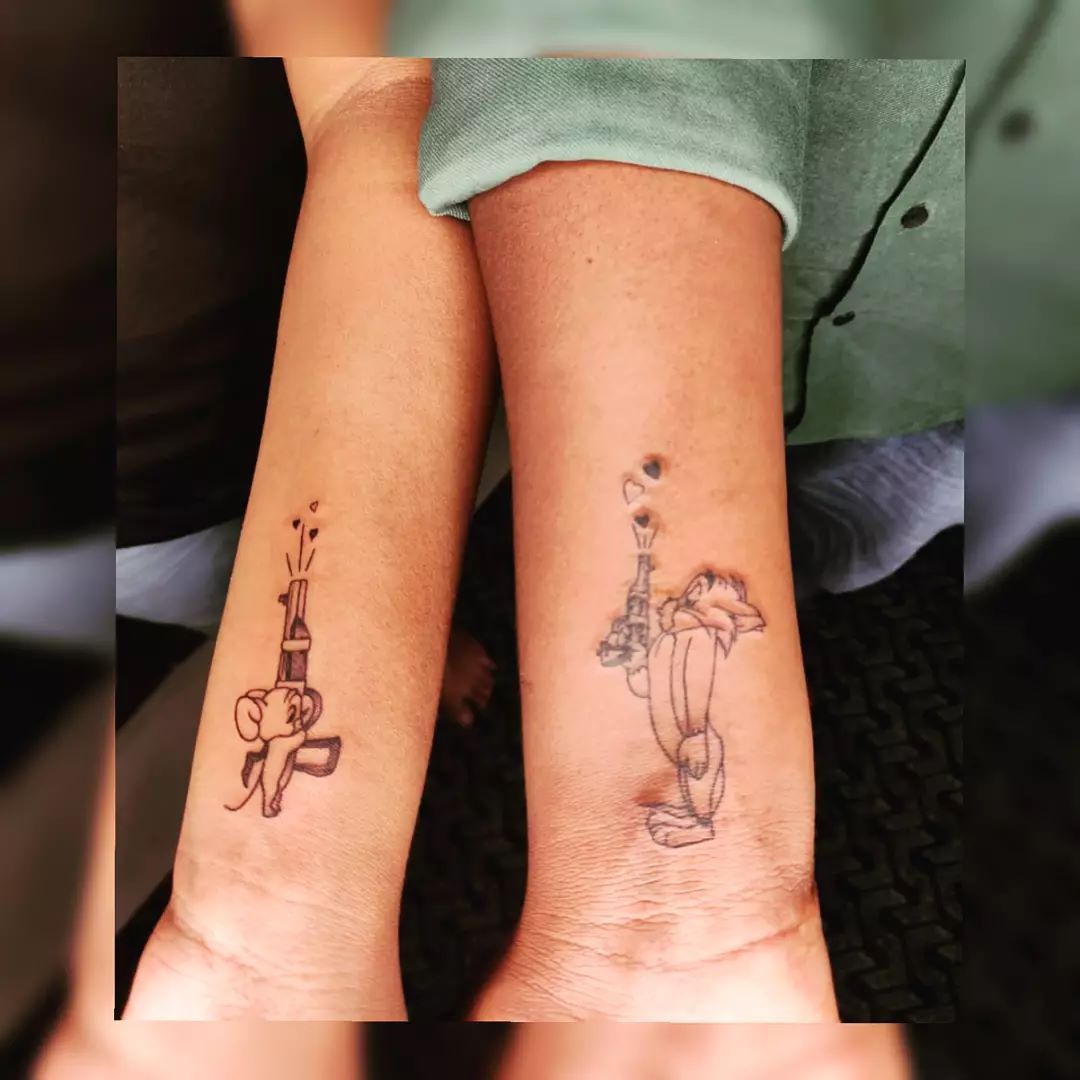 This image showcases two playful tattoos featuring beloved cartoon characters that perfectly capture the fun spirit between siblings. One tattoo features a cute elephant holding a colorful gun, while the other shows a stylish character with a heart-shaped weapon, symbolizing their unique bond. Choosing matching tattoos like these can be a delightful way for brothers and sisters to celebrate their connection and shared memories.