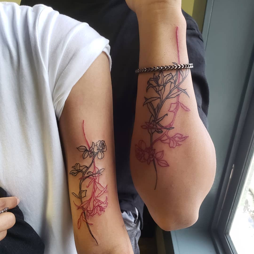 This image showcases two beautifully crafted tattoos that celebrate the bond between siblings through intricate floral designs. Each tattoo features a unique blend of colors and lines, highlighting their individual styles while still creating a harmonious look together. When considering matching tattoos, choosing designs that resonate with shared memories can make the experience even more special.
