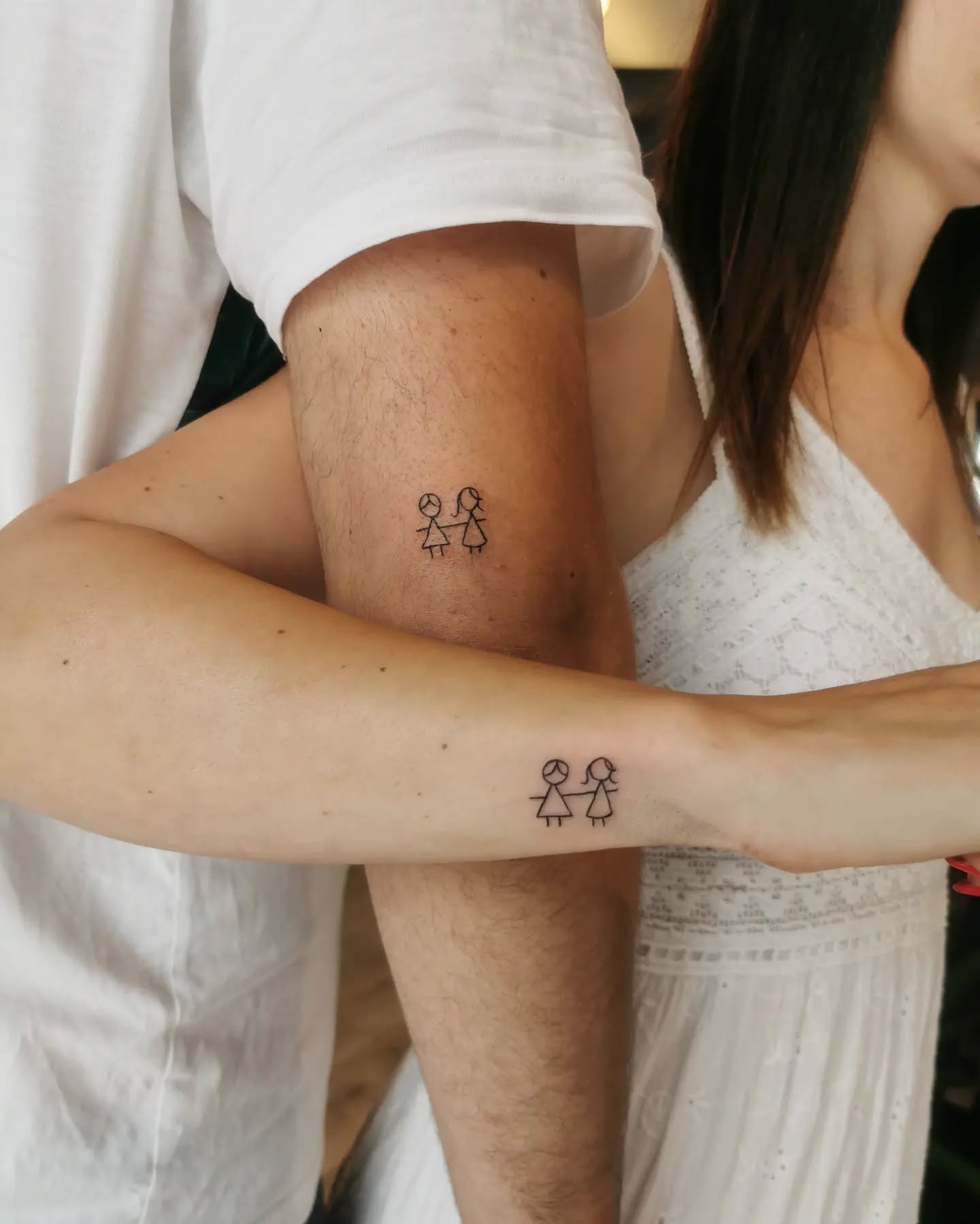 This image showcases a charming tattoo design that beautifully represents the bond between a brother and sister. The playful stick figures, holding hands, symbolize their unique connection and shared experiences. For those considering matching tattoos, opting for simple yet meaningful designs can create lasting memories.