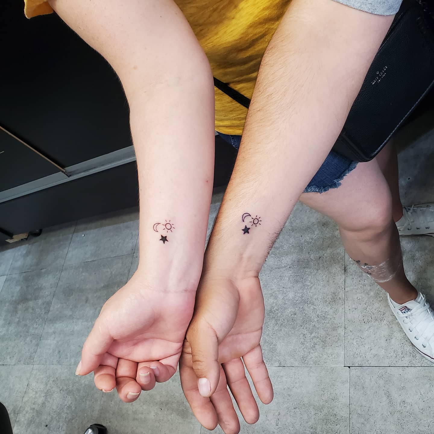 This image showcases a beautiful bond between siblings, highlighted by matching sun and moon tattoos on their wrists. The simple yet meaningful designs symbolize their connection, representing how they balance each other out, much like day and night. Choosing a design that reflects personal significance can make brother-sister tattoos even more special.