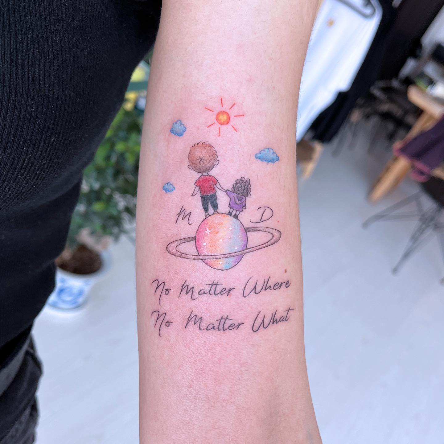 This tattoo captures a whimsical scene of a brother and sister standing together on a colorful planet, gazing at the sun and clouds above. The touching phrase, “No matter where, no matter what,” emphasizes the unbreakable bond they share, making it a perfect tribute to sibling love. For anyone considering a tattoo with a meaningful message, this design beautifully illustrates the idea of always being there for each other.