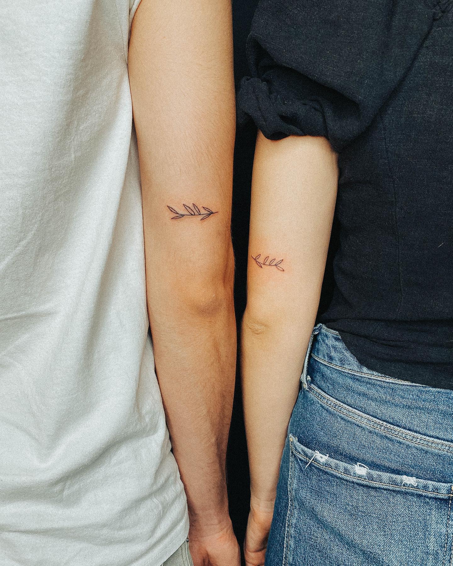 This image beautifully captures a pair of simple yet meaningful tattoos on a brother and sister’s arms, showcasing their unique bond. The delicate leaf designs symbolize growth and harmony, reflecting the special relationship they share. Choosing designs that resonate with personal stories can make tattoos even more memorable.