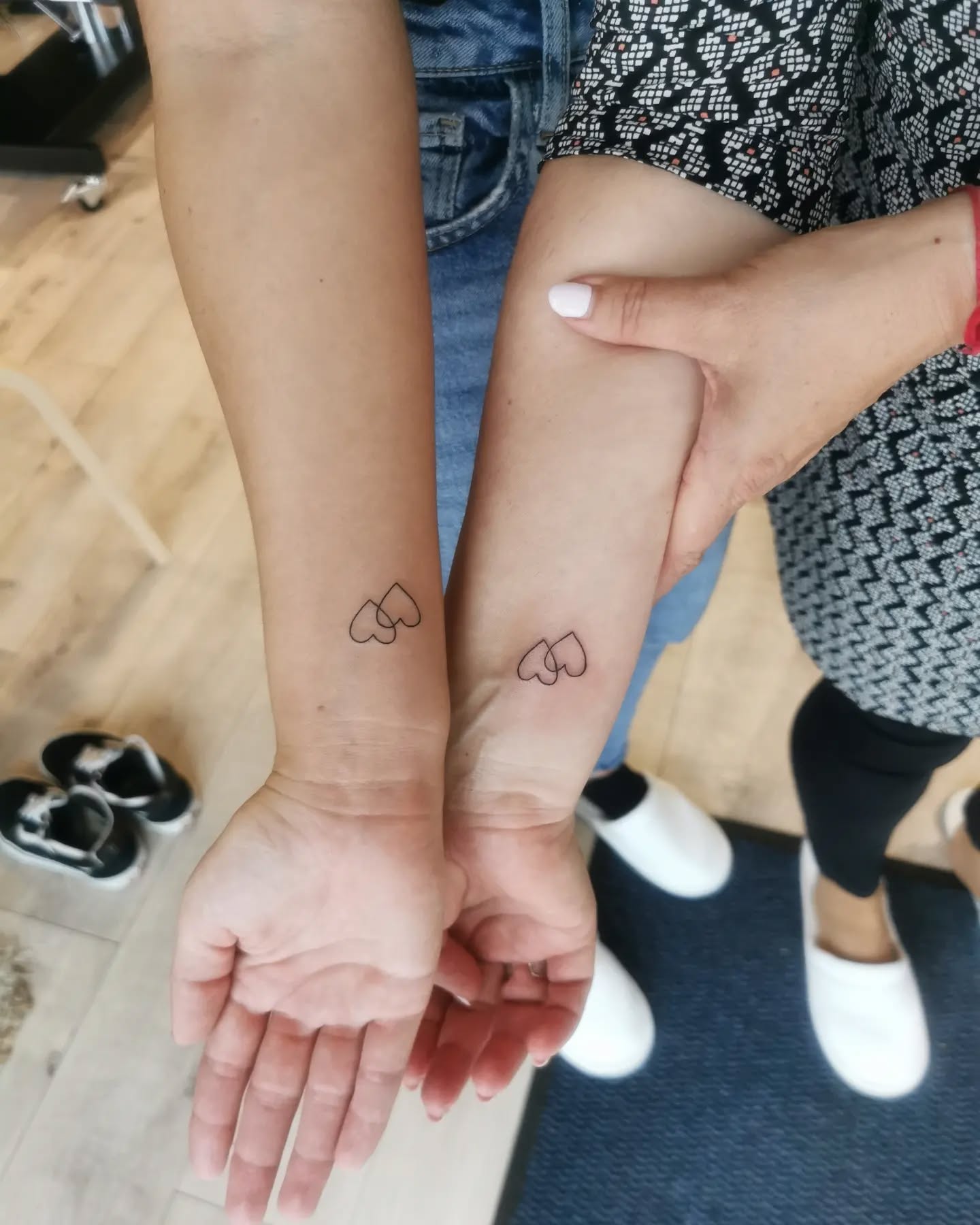 This image captures two siblings showcasing their charming matching heart tattoos on their wrists. The simple yet meaningful designs symbolize their bond, reminding them of the love they share. Choosing matching tattoos can be a fun way for brothers and sisters to celebrate their relationship and create lasting memories together.