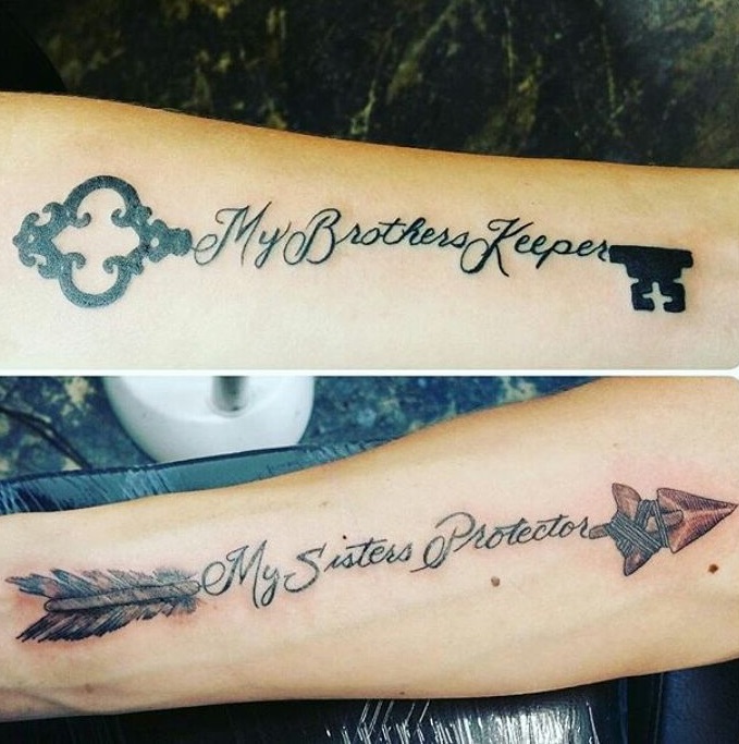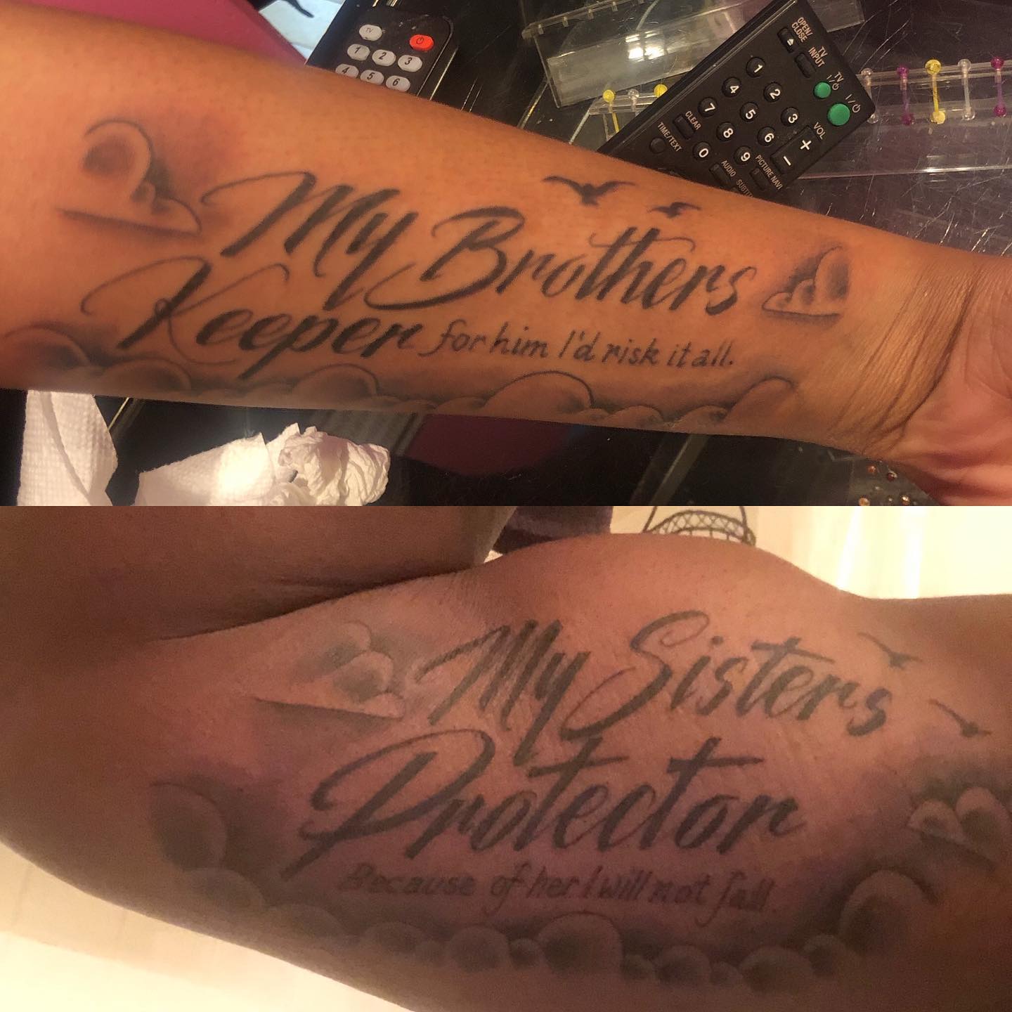 This image beautifully showcases matching tattoos that celebrate the bond between a brother and sister. The heartfelt phrases, “My Brother’s Keeper” and “My Sister’s Protector,” highlight their commitment to each other, making these tattoos truly special. When considering a similar design, think about personal words or symbols that represent your unique relationship.