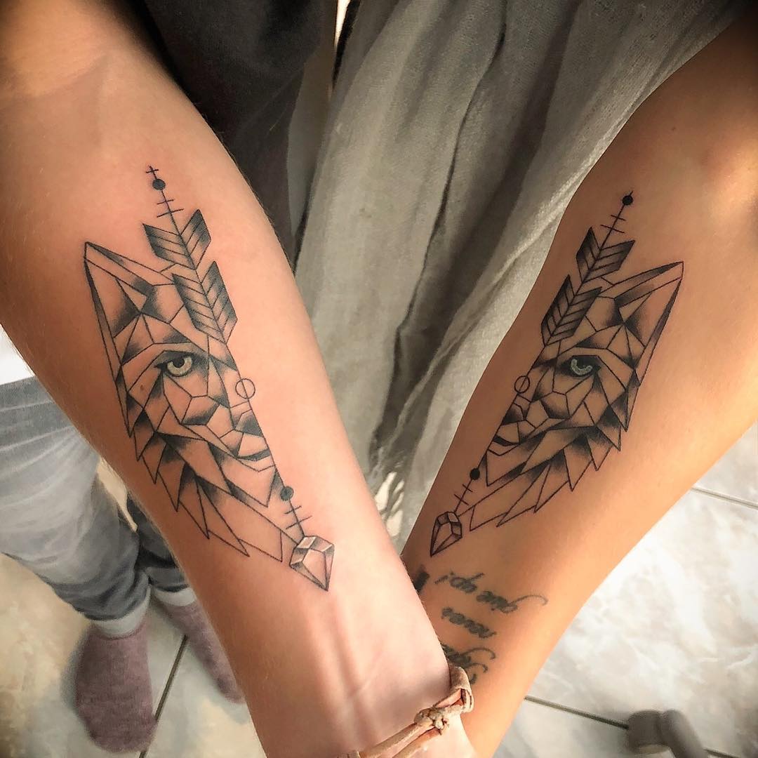 This striking image features two beautifully designed wolf tattoos, showcasing a strong bond between siblings. The geometric style and attention to detail make these tattoos truly stand out, symbolizing loyalty and protection. When choosing a tattoo, consider designs that reflect your shared interests or experiences for a lasting connection.