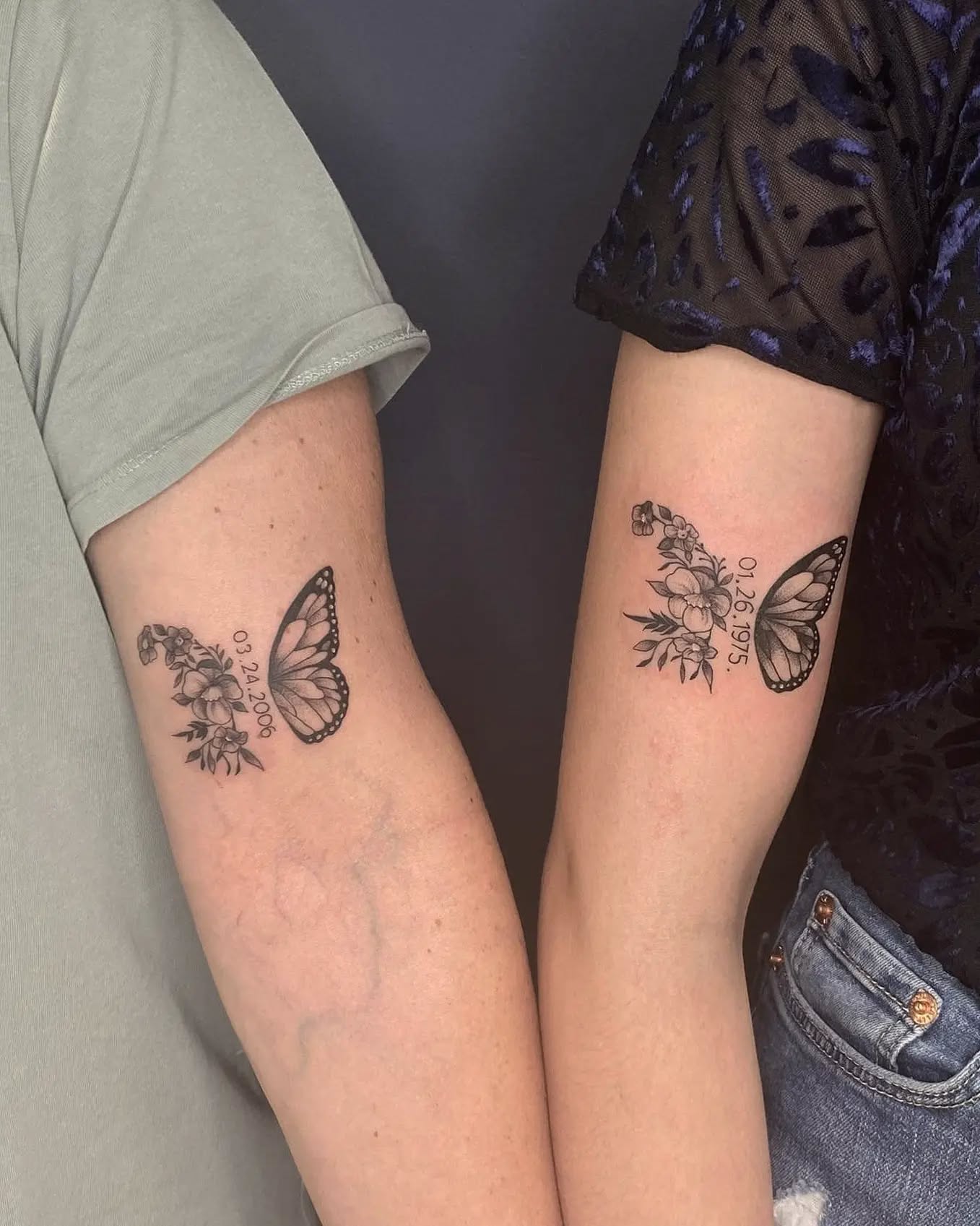 This image showcases a beautiful pair of tattoos featuring delicate butterflies and flowers, symbolizing a close sibling connection. Each tattoo includes meaningful dates, making them a personal and cherished reminder of shared moments. For those considering matching tattoos, choosing a design that reflects a special bond can make the experience even more memorable.