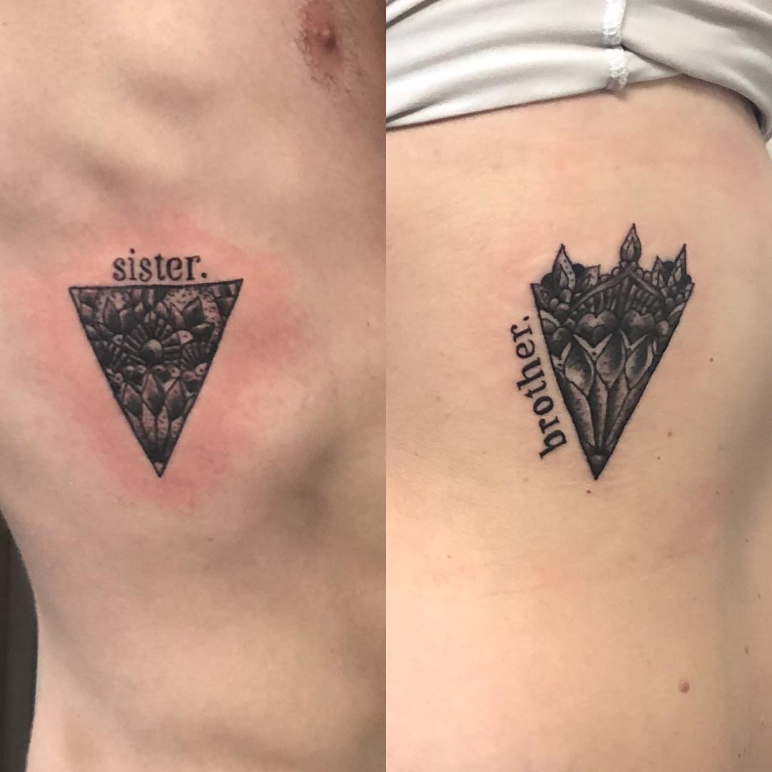 This image showcases two arms adorned with matching triangular tattoos, creating a striking visual bond between siblings. The sleek design symbolizes their shared experiences and unity, making it a meaningful choice for a brother and sister. When considering a tattoo, opting for a design that reflects personal significance can deepen the connection it represents.