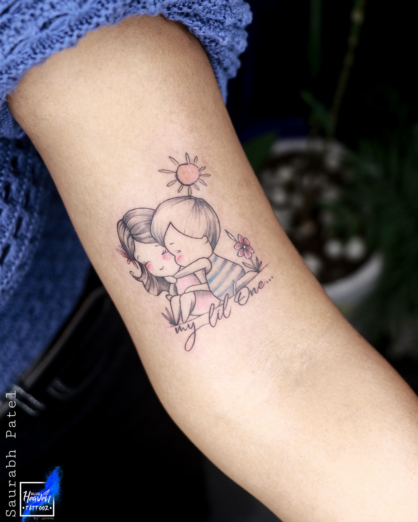 This delightful tattoo captures the heartwarming bond between a brother and sister with its playful illustration of two kids sharing a sweet embrace. The cheerful sun above and the colorful flowers add a whimsical touch, making it a perfect tribute to their unique relationship. Choosing a design that reflects shared memories can make brother sister tattoos even more special.