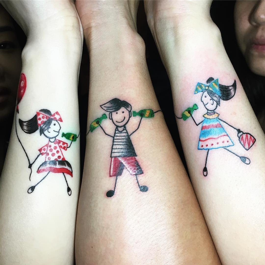 This image showcases delightful tattoos of playful stick figures, each representing a brother and sister enjoying a fun moment together. With bright colors and cheerful expressions, these designs capture the joyful spirit of sibling relationships. For those considering similar tattoos, choosing a design that reflects shared memories can make the bond even more special.