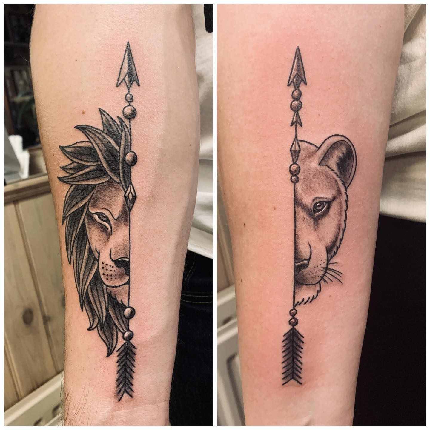 This striking tattoo design features a fierce lion and a graceful lioness, symbolizing a strong bond between siblings. The unique arrow design connecting them adds depth, representing guidance and shared adventures. When choosing a tattoo with your sibling, consider designs that reflect your personalities or shared memories for a more meaningful connection.