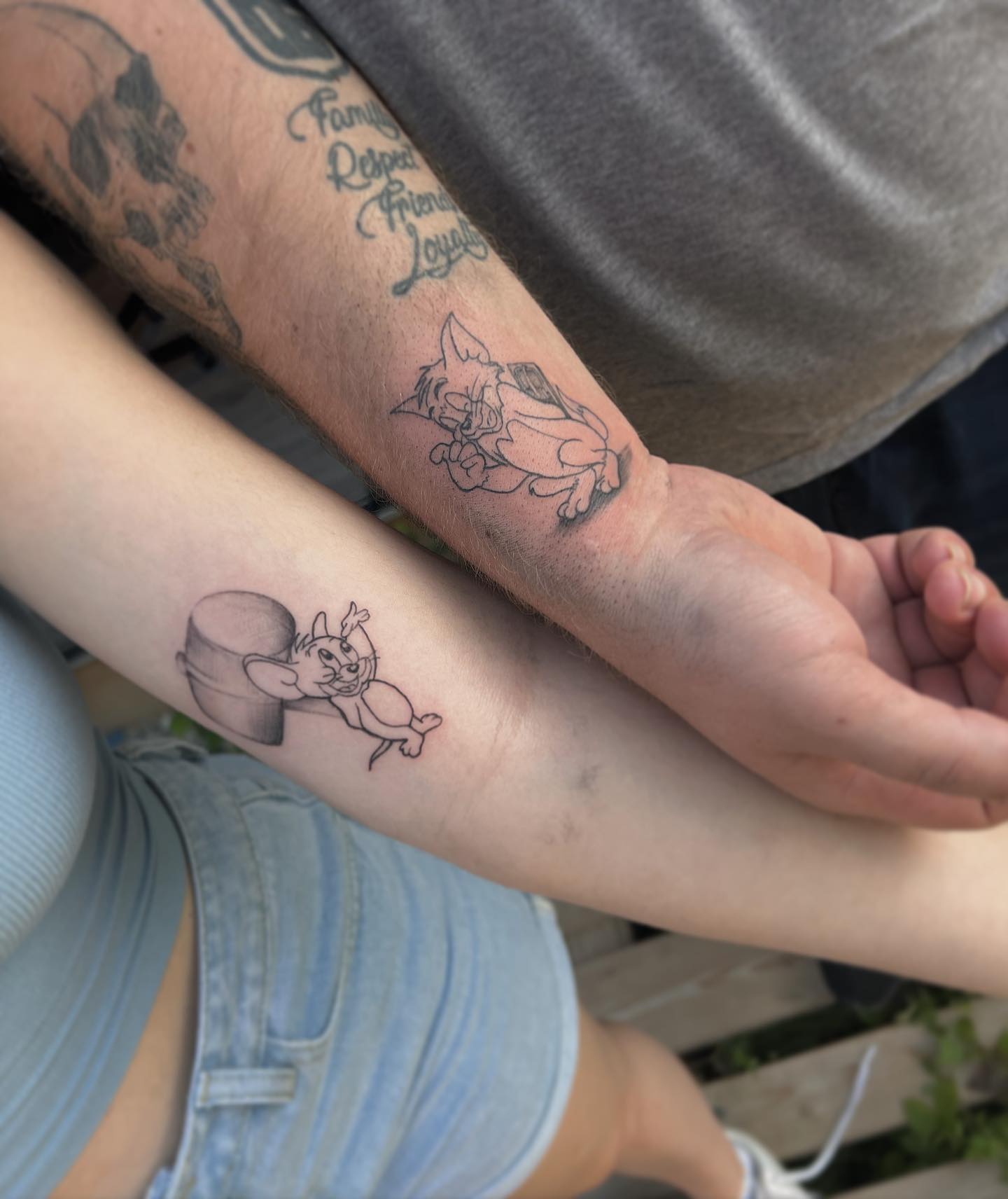 This delightful image captures the playful spirit of brother-sister tattoos featuring the iconic duo of Tom and Jerry. Each character symbolizes the fun and sometimes chaotic relationship siblings share, reminding them of their childhood adventures. For those considering a similar design, choosing a meaningful character can add a personal touch to the tattoo experience.