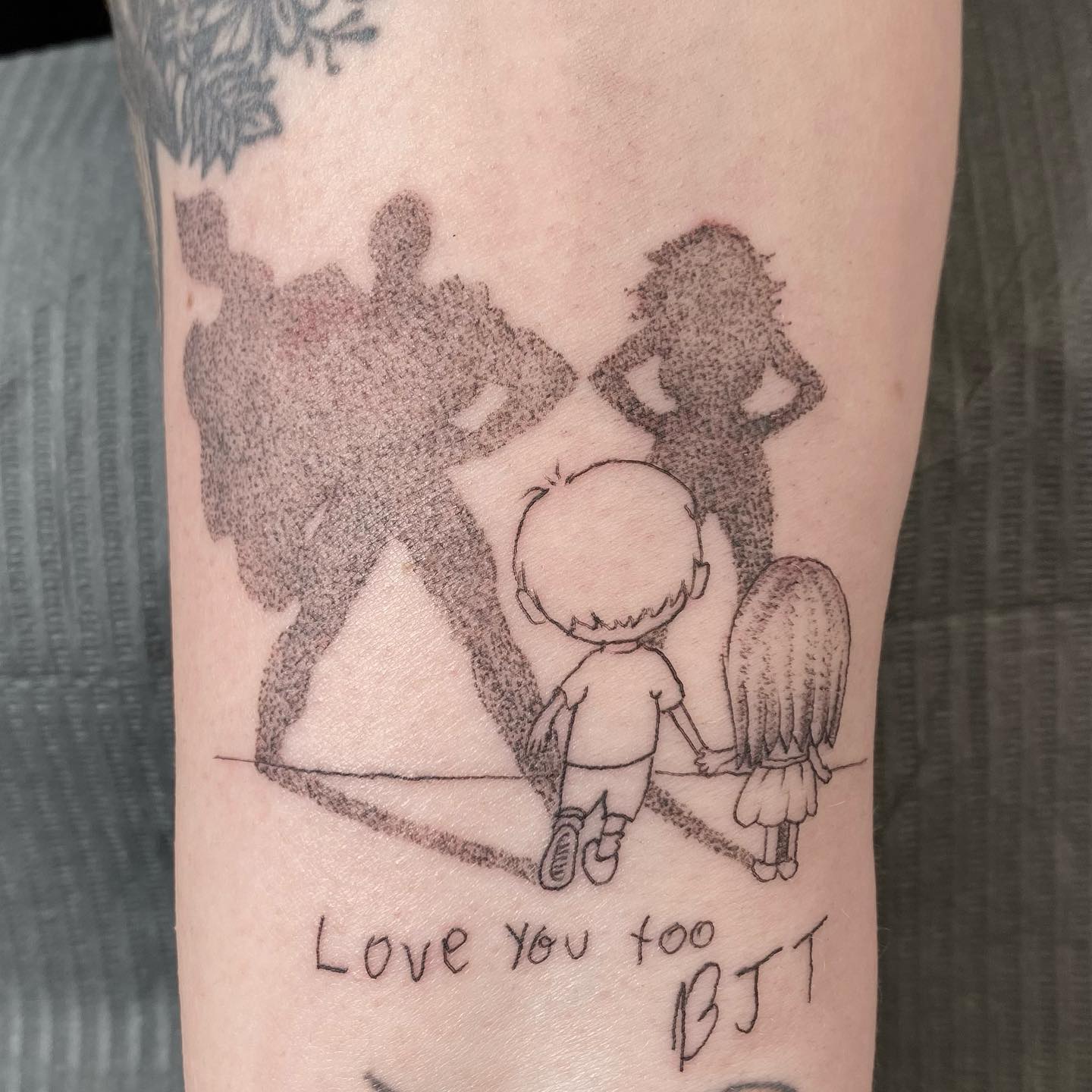 This tattoo beautifully captures a sweet moment between a brother and sister, walking hand in hand toward shadowy figures that symbolize their parents or guardians. The playful design and heartfelt message, “Love you too,” add an extra layer of warmth and connection. For those considering sibling tattoos, think about incorporating personal elements that reflect your unique relationship.