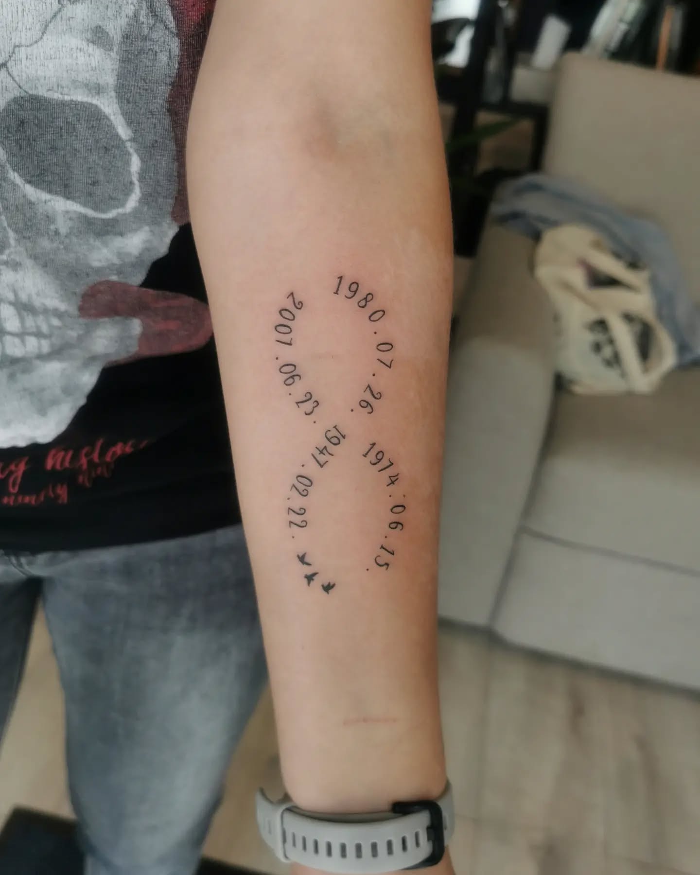 This tattoo beautifully showcases a series of important dates, forming a unique circle that symbolizes the journey of life. Each number tells a story, perhaps representing significant moments shared between siblings or family members. A great tip for anyone considering similar designs is to choose dates that hold personal meaning to make the tattoo even more special.