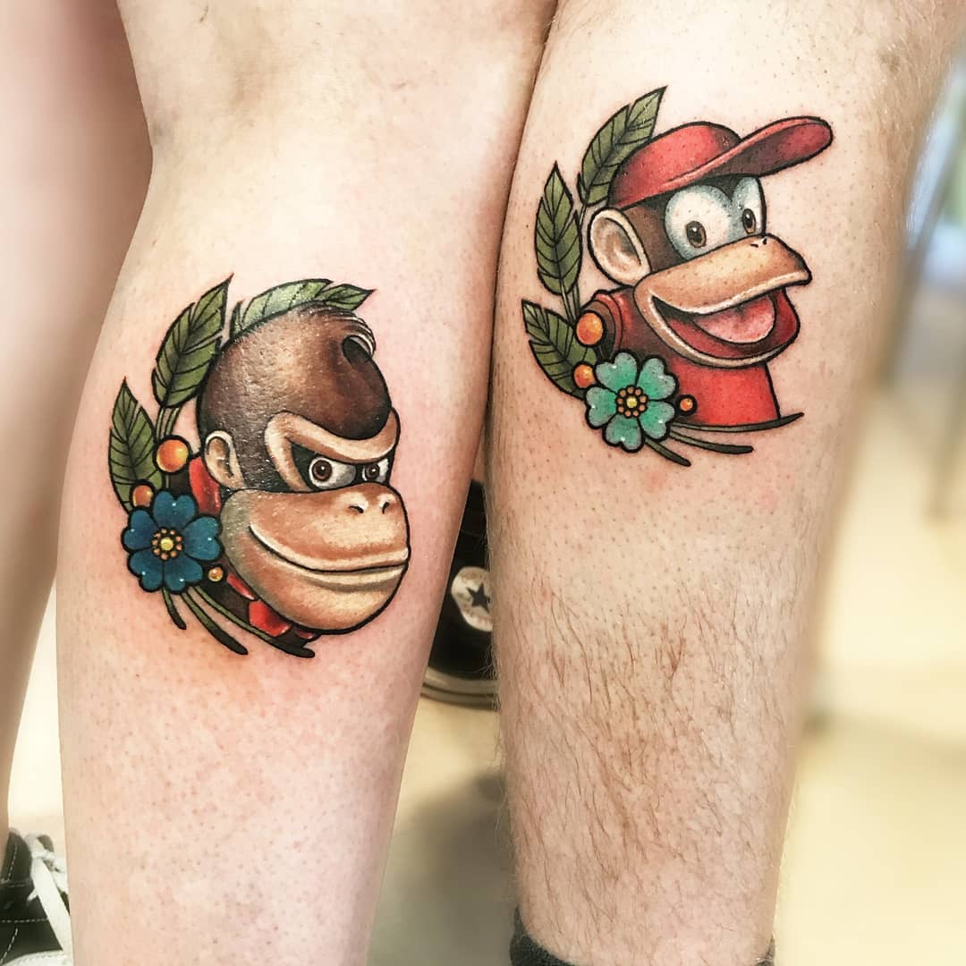 This image features two vibrant tattoos of beloved cartoon monkeys, each adorned with colorful flowers and leaves. The playful designs capture the spirit of fun and creativity, making them a perfect choice for siblings who share a love for gaming or childhood memories. Choosing tattoos that represent shared interests can strengthen the bond between brothers and sisters, turning a simple design into a cherished symbol of their relationship.
