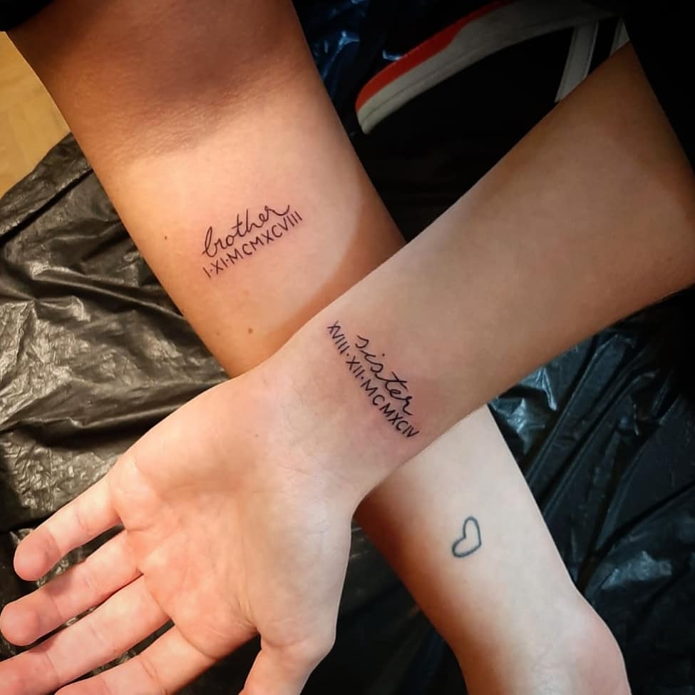 This image captures the heartfelt connection between a brother and sister through their matching tattoos. The elegant script not only displays their titles but also includes special dates that signify their bond. Choosing meaningful tattoos like these can be a wonderful way to celebrate family ties and create lasting memories.