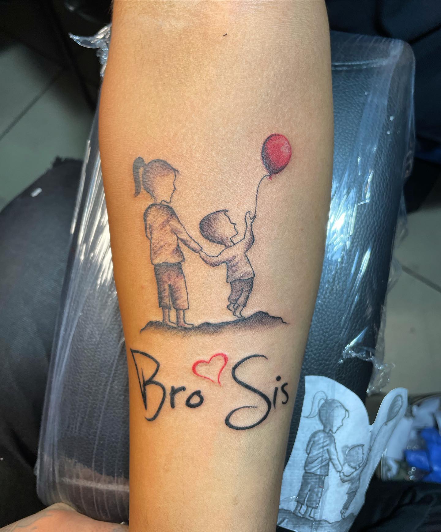 This tattoo beautifully captures the joyful connection between a brother and sister, showcasing a tender moment as they share a balloon. The playful design highlights their bond, making it a charming tribute to sibling love. For those considering a similar tattoo, think about incorporating personal elements that reflect your unique relationship.