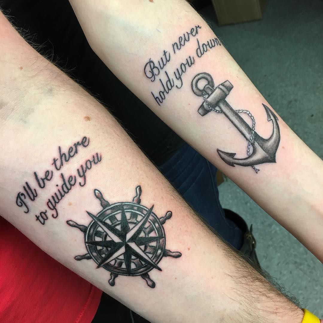 This image showcases beautiful tattoos that symbolize a deep bond between siblings. The compass and anchor designs represent guidance and support, reminding each other that they will always be there to navigate life’s challenges together. Choosing meaningful tattoos like these can strengthen their special connection even further.