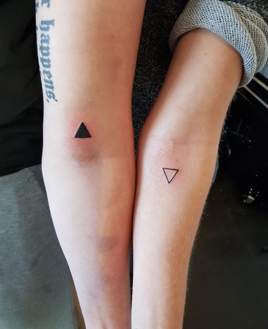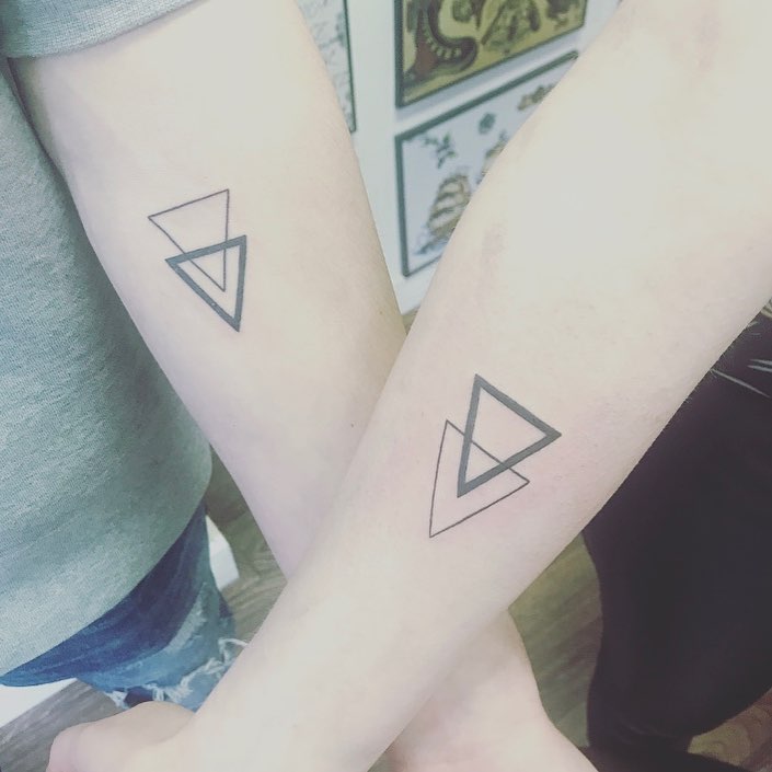 This image showcases a pair of simple yet striking triangle tattoos on the forearms of a brother and sister. The unique design symbolizes their bond and individuality, with one triangle pointing up and the other pointing down, creating a captivating visual contrast. Choosing matching tattoos can be a fun way for siblings to express their connection while still celebrating their unique personalities.