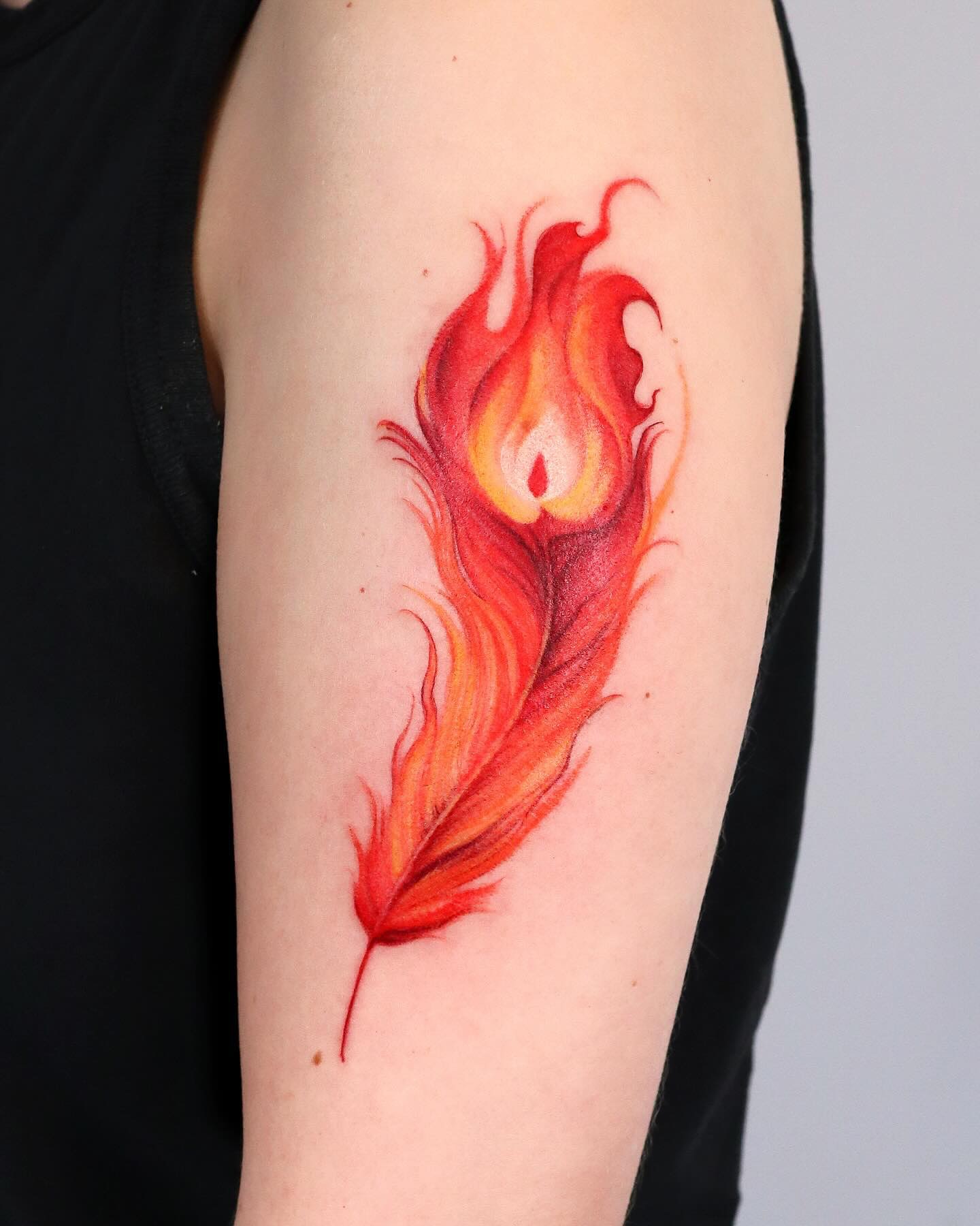 The tattoo features a vibrant feather in shades of red and orange that resembles flames.