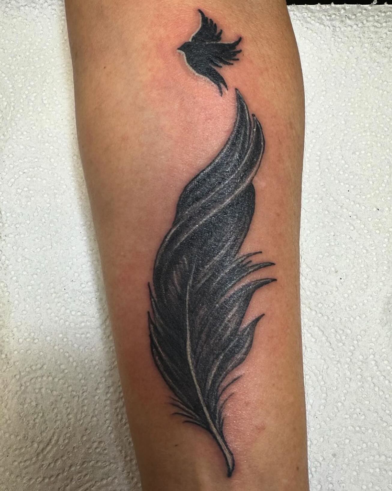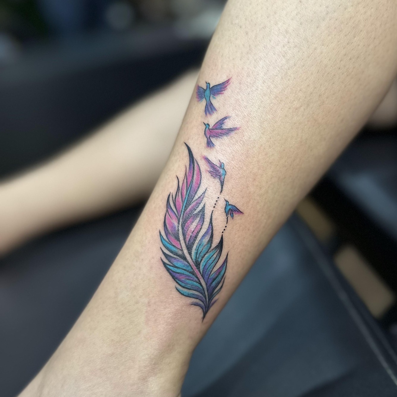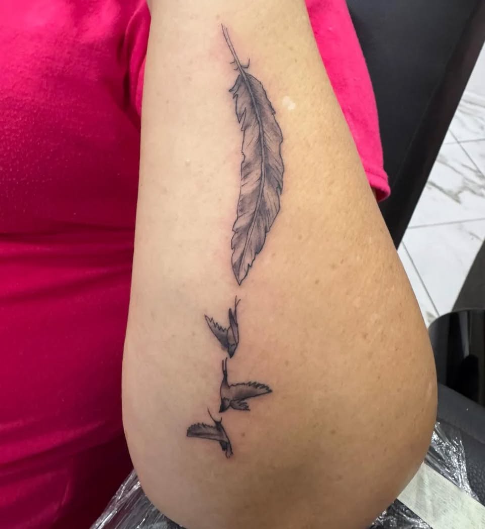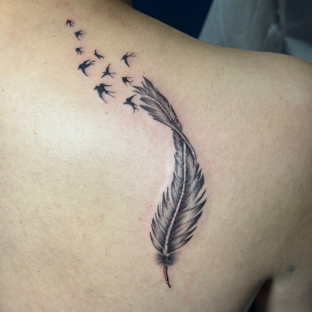The tattoo features a detailed feather that gracefully transitions into a flock of small birds.