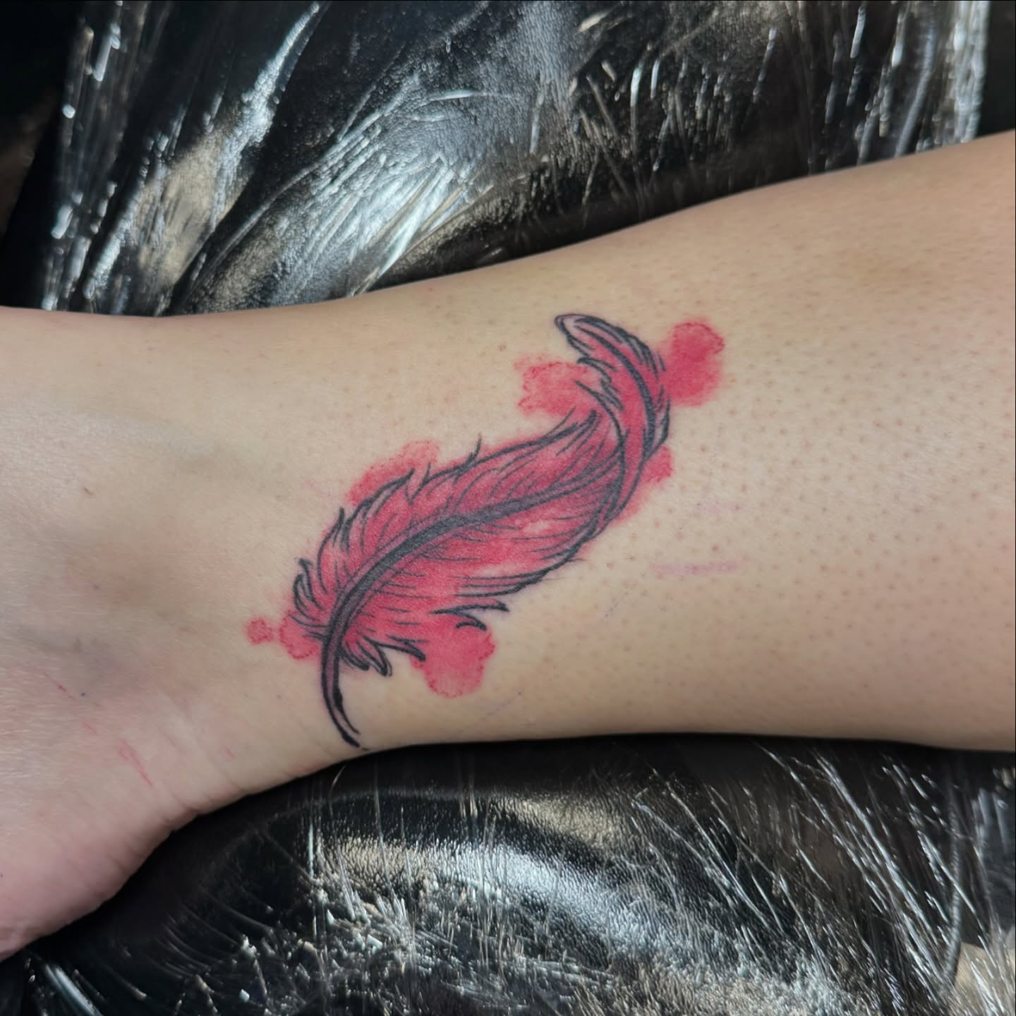 The tattoo features a delicate feather design that incorporates striking shades of red, creating a vivid contrast against the skin.