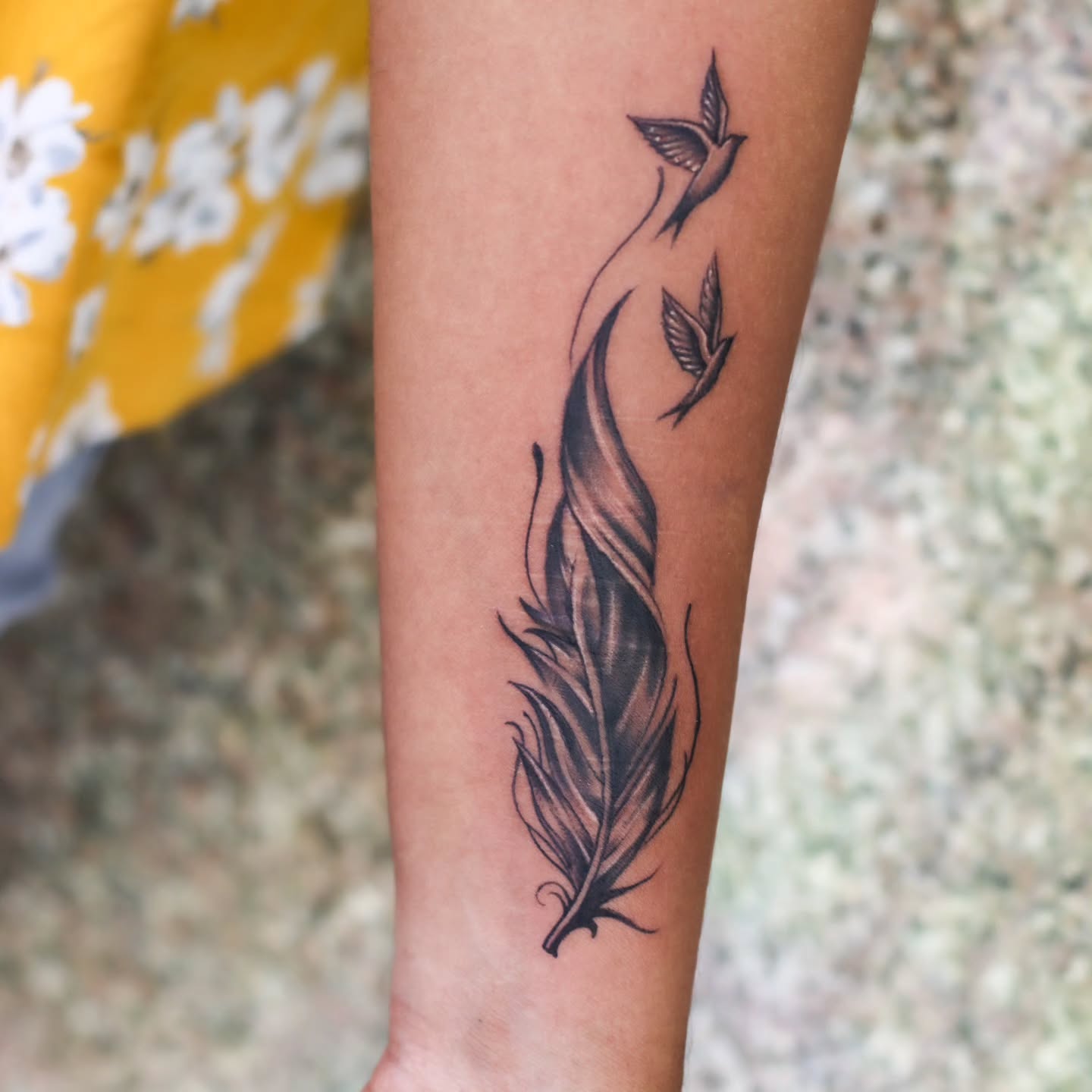 The design features a large, detailed feather that gracefully flows down the arm, accompanied by two small birds.