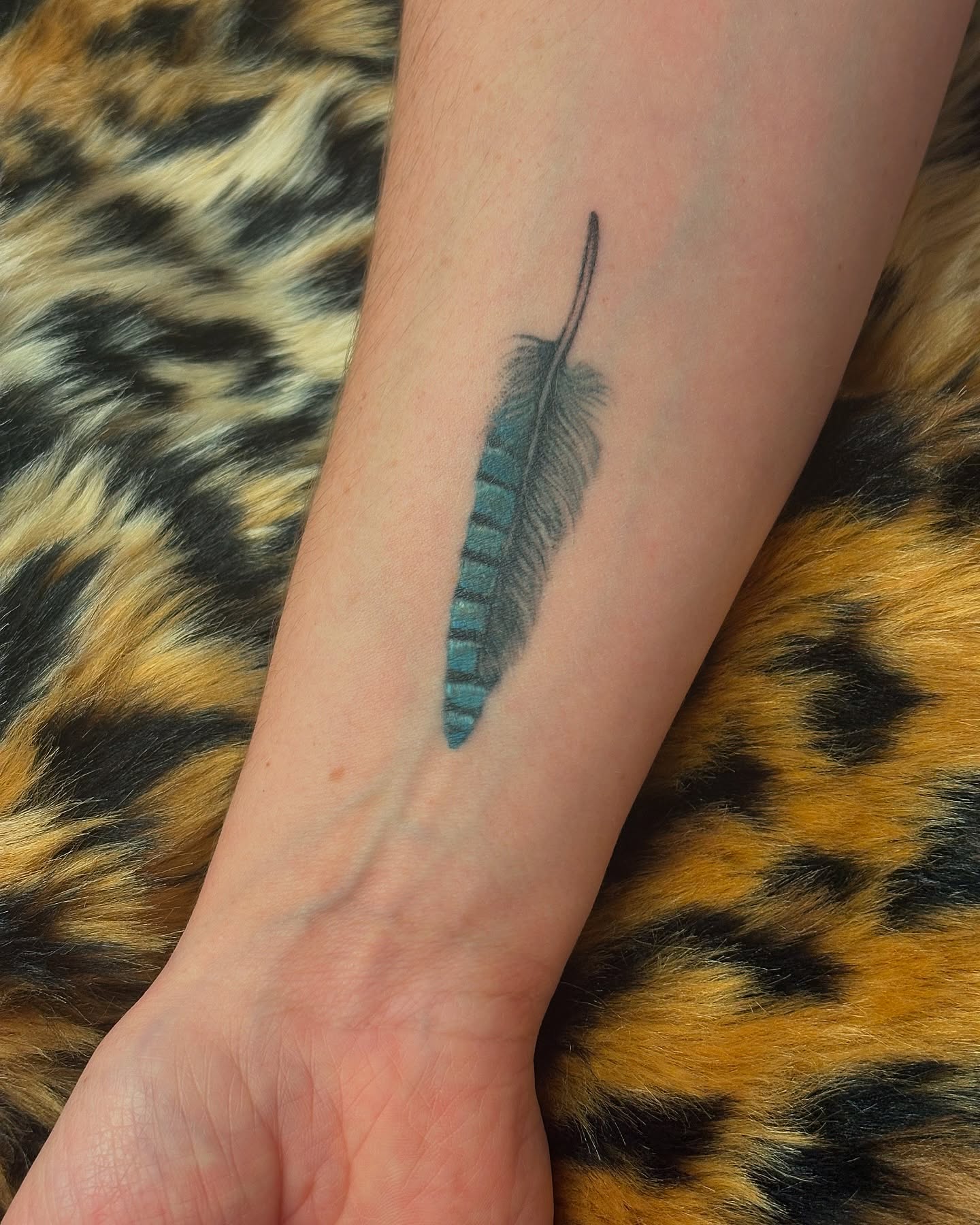 The tattoo features a long feather in shades of teal, accentuated by distinct stripes along its length.