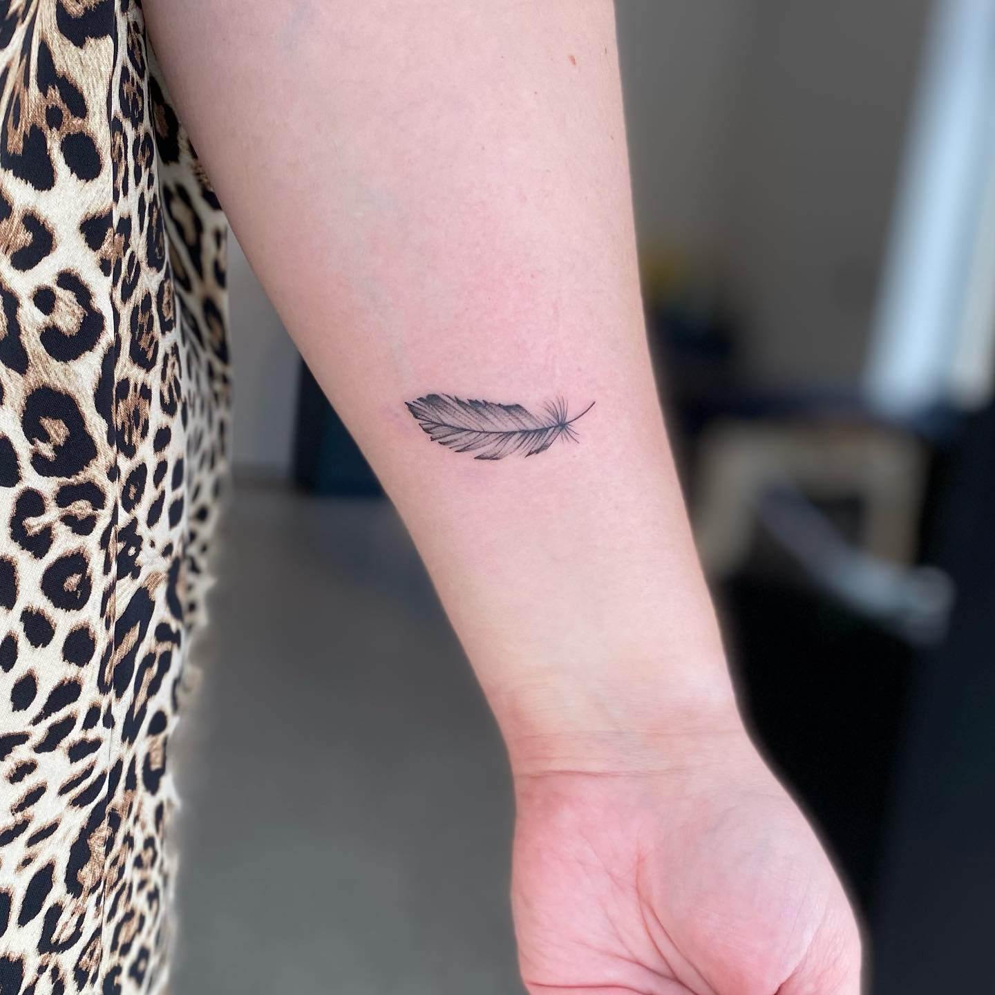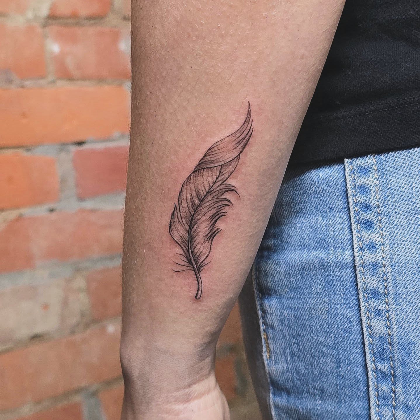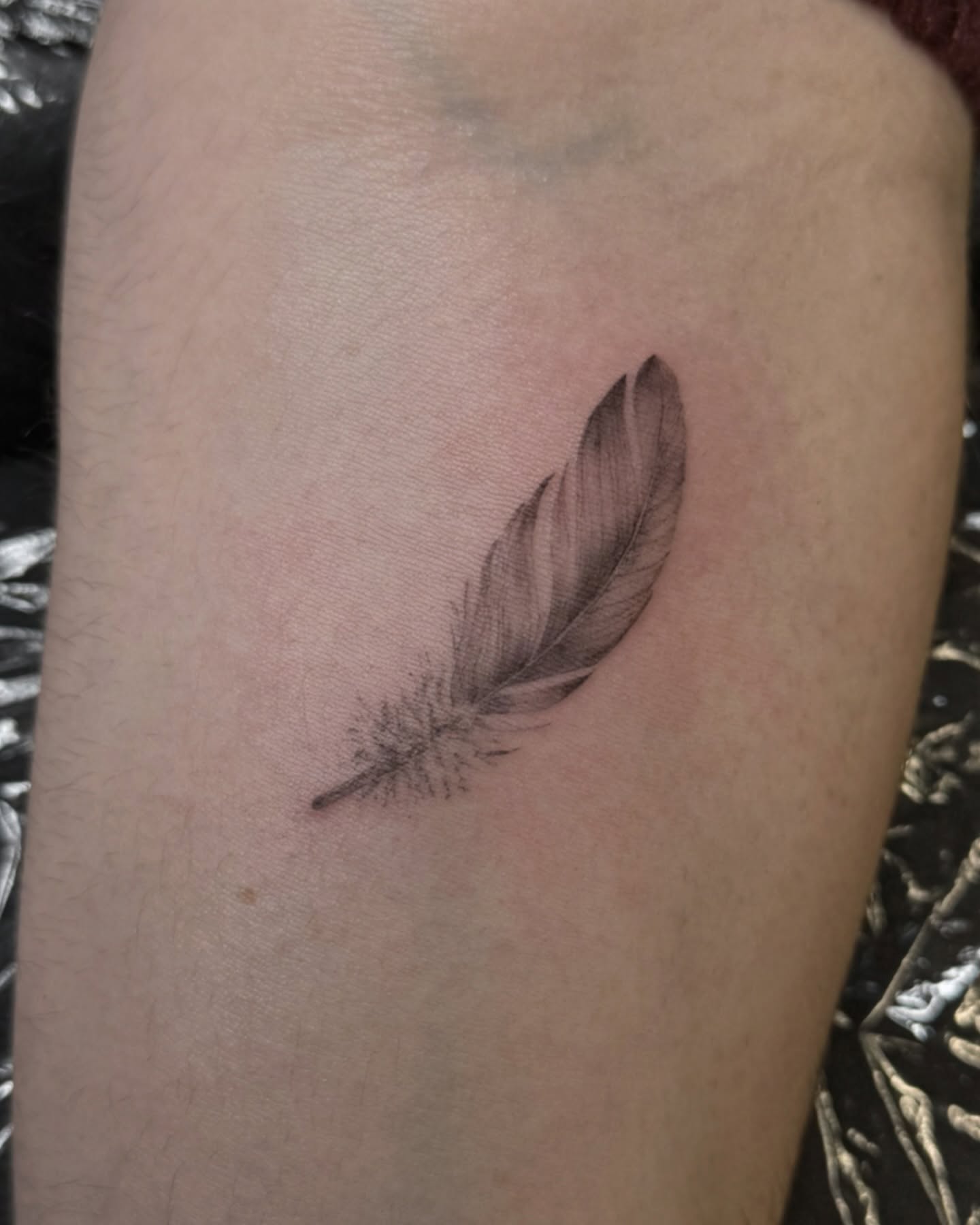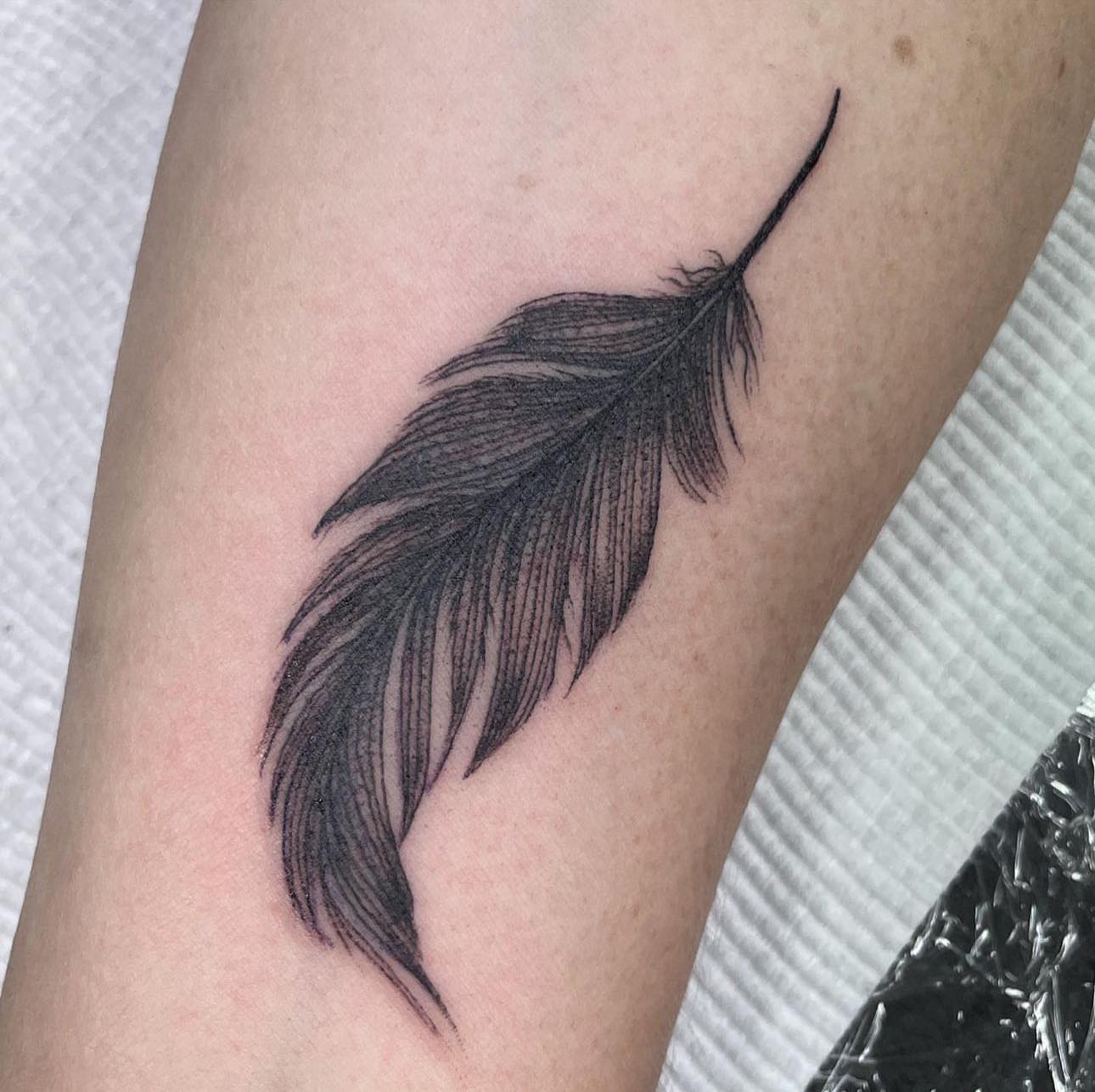 A detailed feather tattoo features soft lines and intricate shading that mimic the natural texture of a real feather.