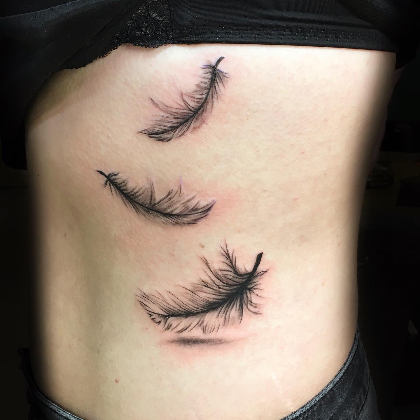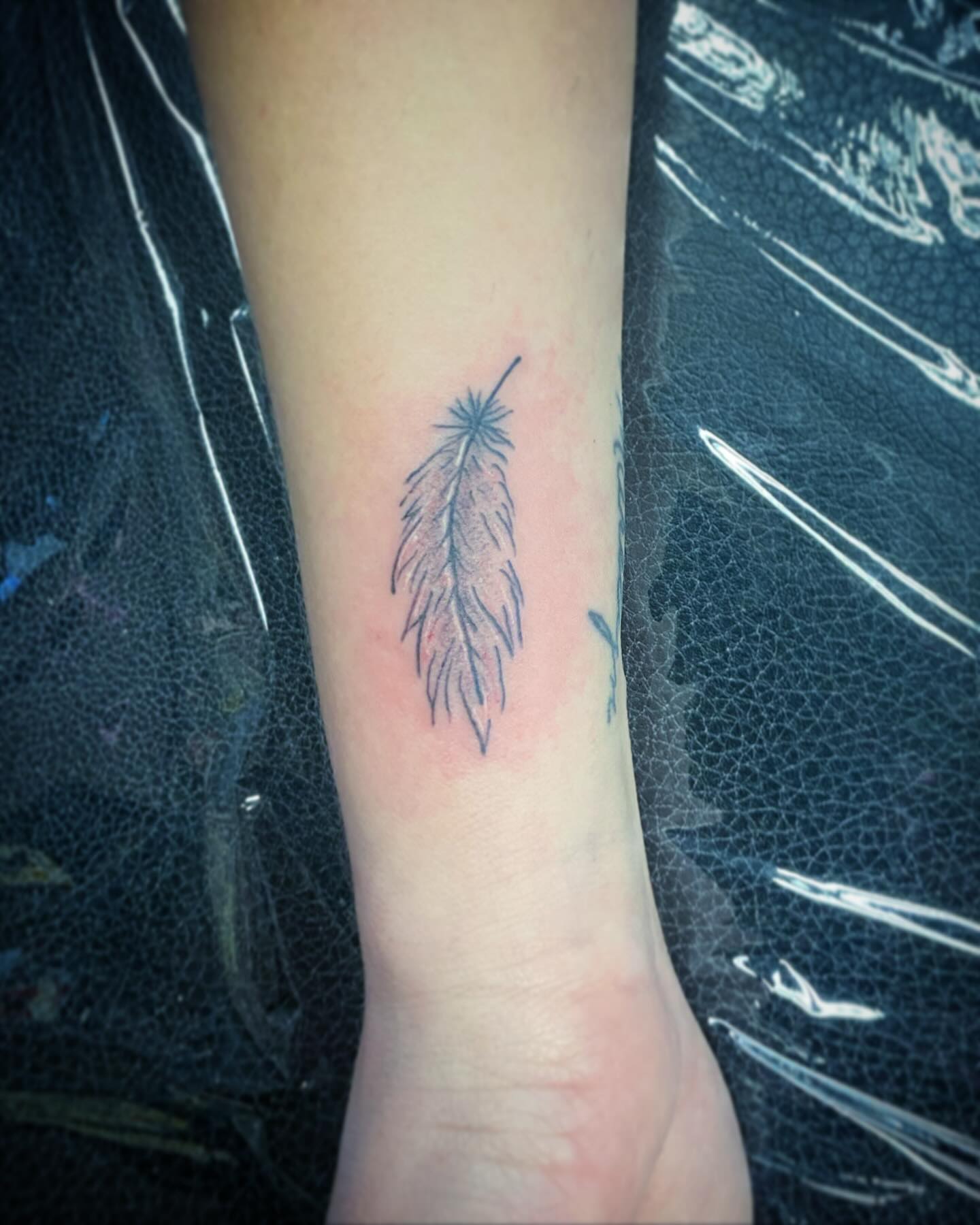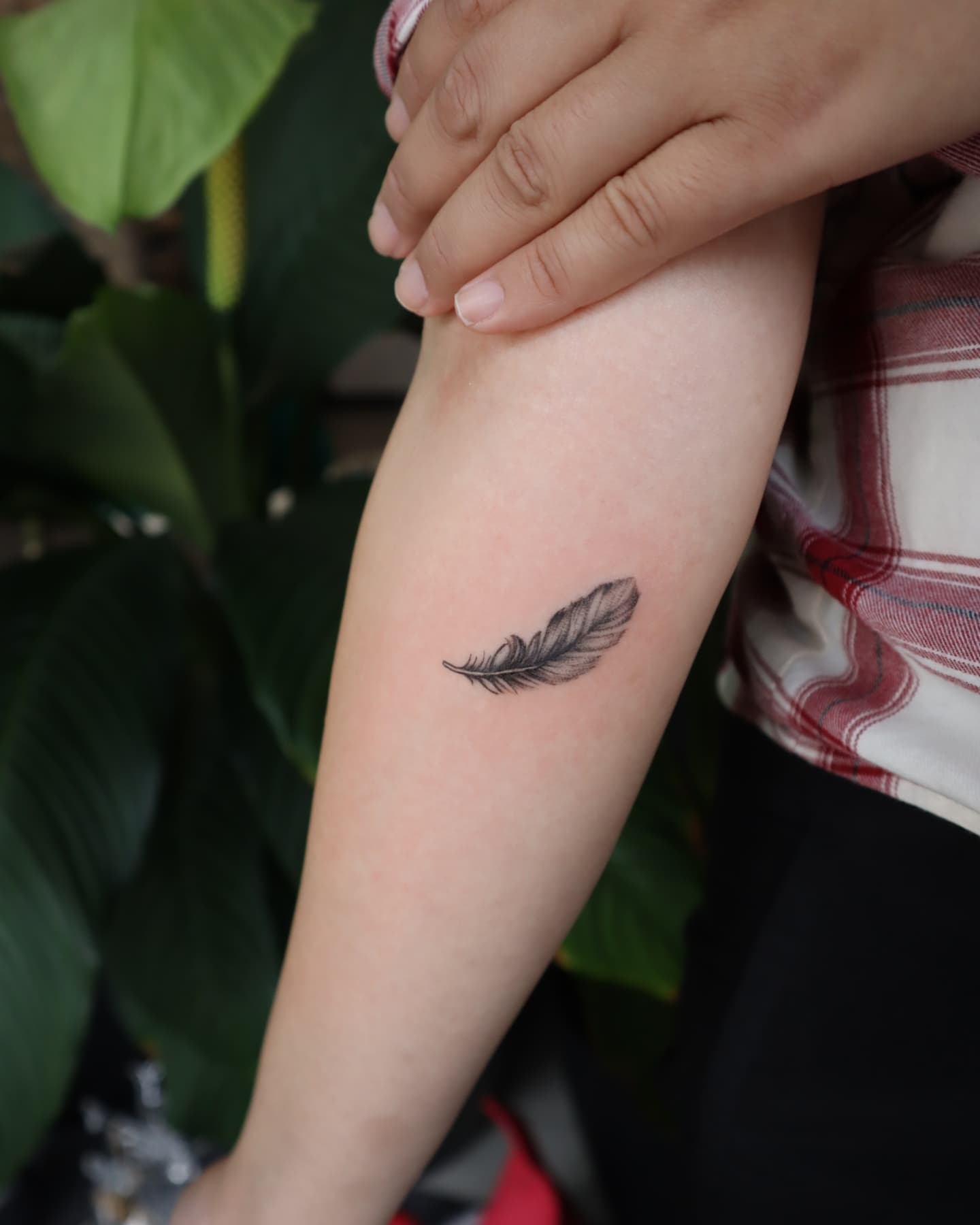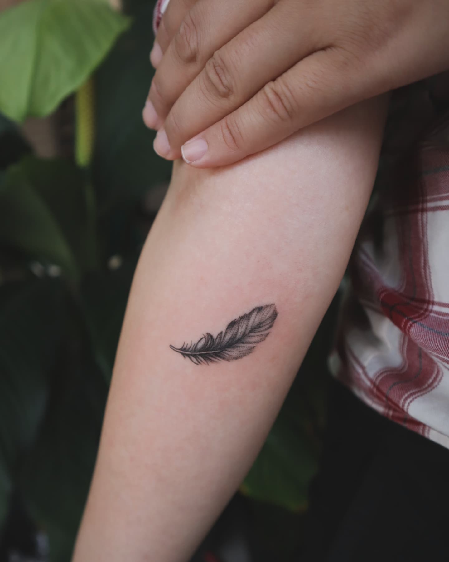 A detailed feather tattoo features soft lines and intricate shading that mimic the natural texture of a real feather.