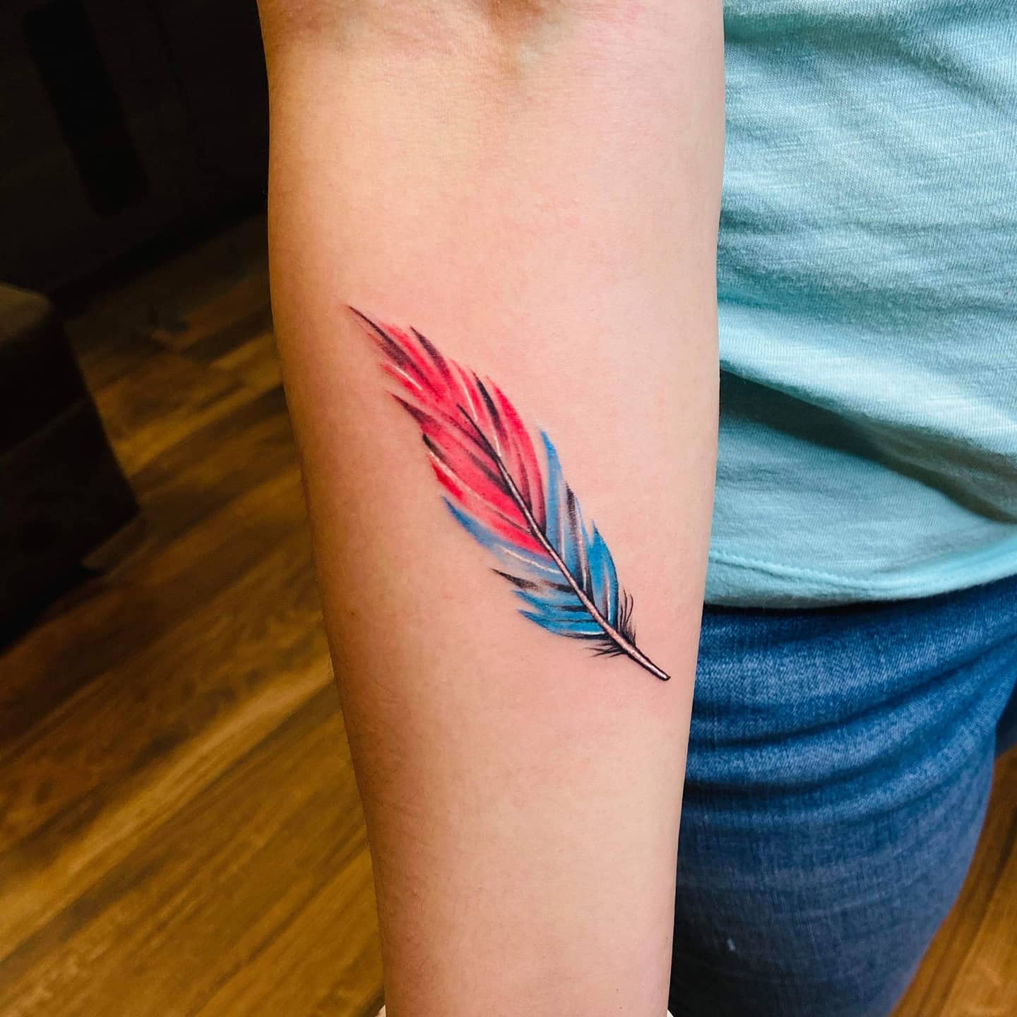 The tattoo features a large, colorful feather that blends shades of blue and pink, creating a striking visual effect.