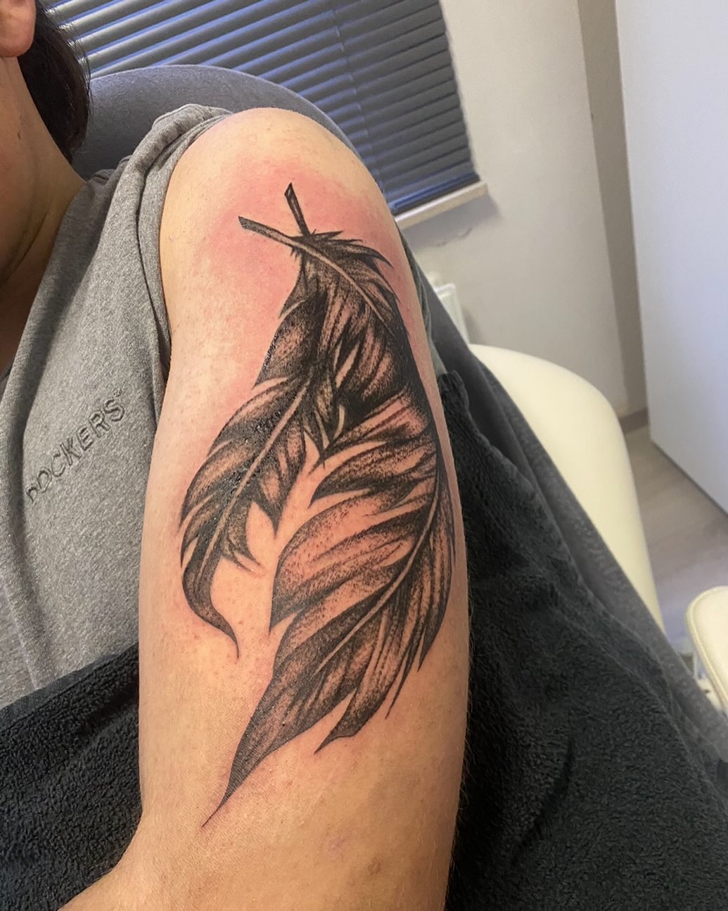 The tattoo features a detailed feather design with intricate lines that create a realistic texture.
