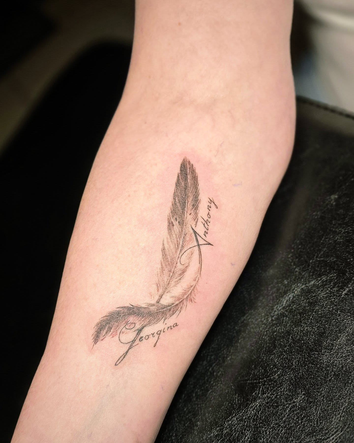 The flowing script and soft shading of the feather create a harmonious balance, making the message feel both personal and artistic.