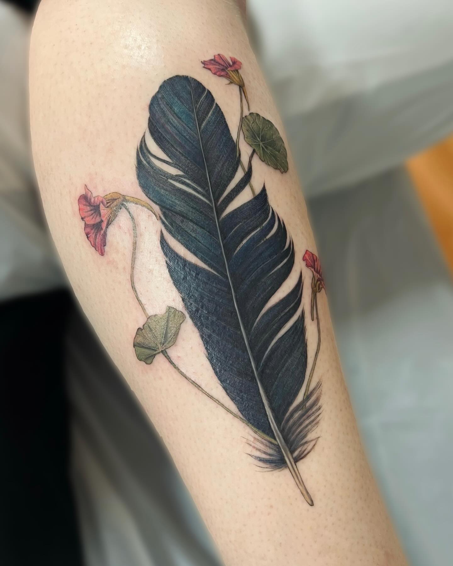 A prominent feather tattoo features deep blue tones, surrounded by delicate pink flowers and green leaves.