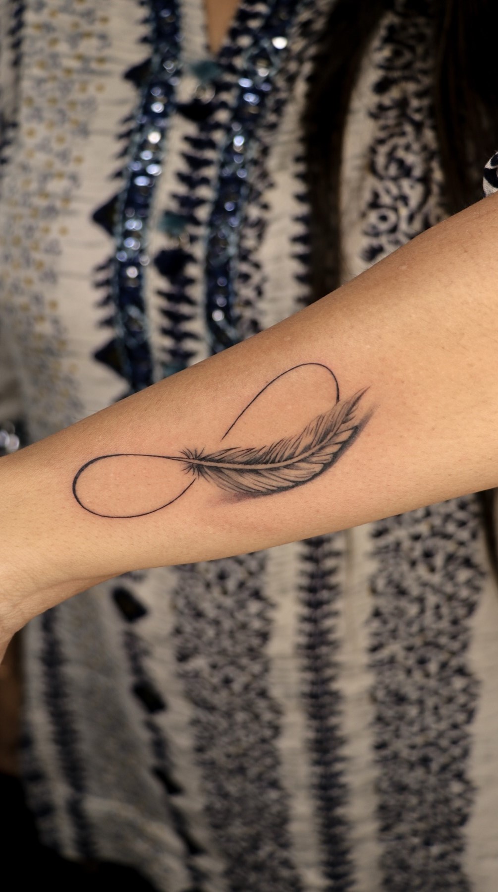 The tattoo features a delicate feather intertwined with an infinity symbol, creating a harmonious flow.