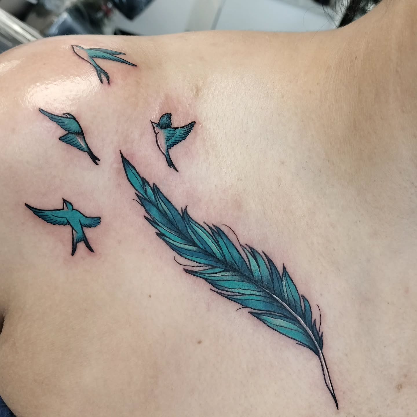 The vibrant turquoise feather stands out prominently on the skin, surrounded by small birds in flight.