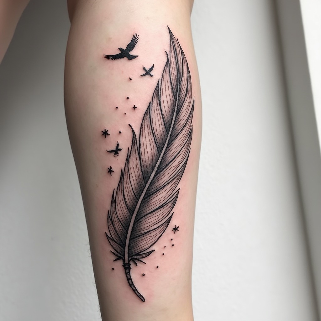 This design combines delicate line work and shading to create a sense of depth and movement, making the feather appear lifelike.