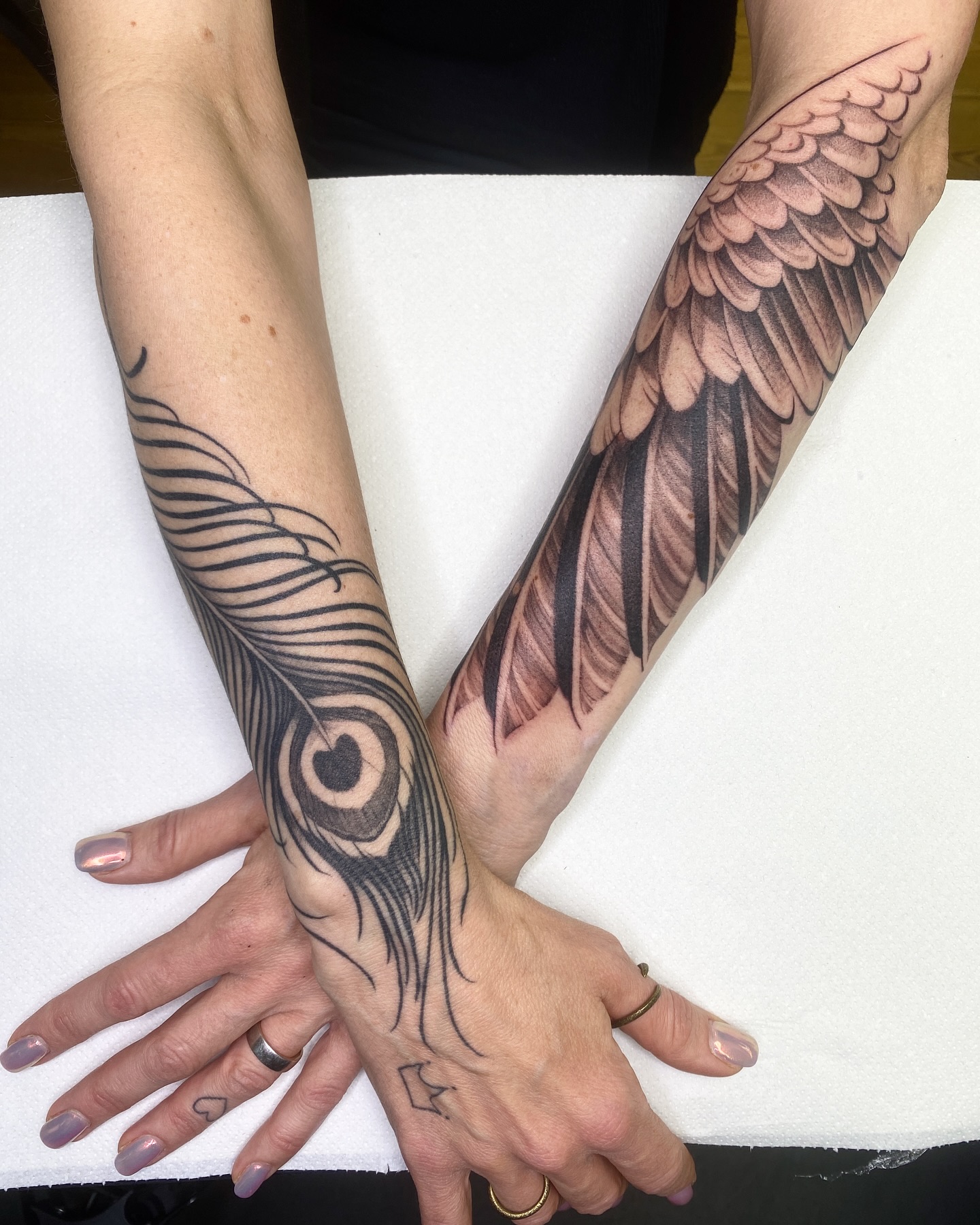 One arm showcases an intricate peacock feather design with swirling lines and a bold eye feature, while the other displays a realistic wing with layered shading.