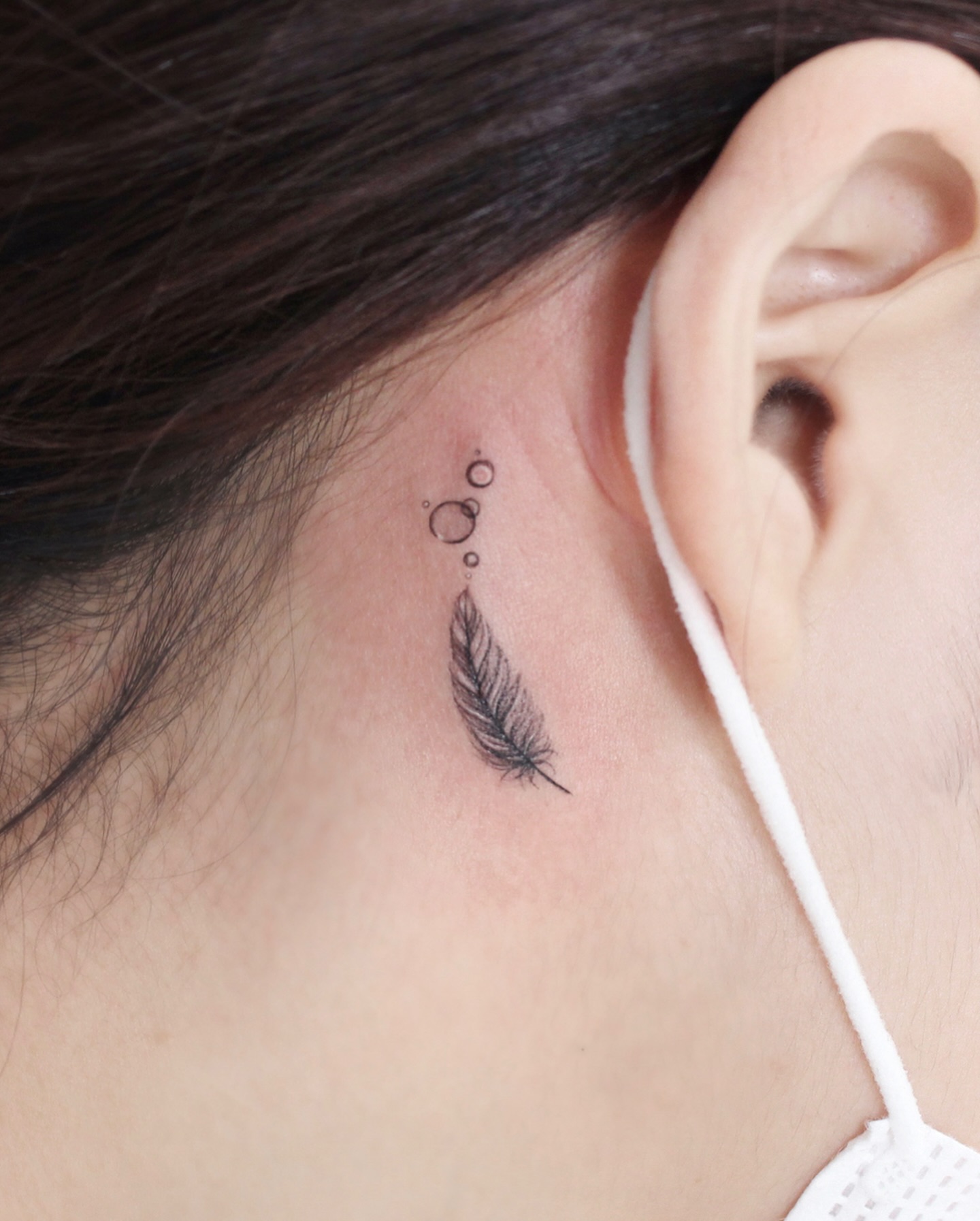 The tattoo showcases a finely detailed feather positioned just behind the ear, accompanied by small circular bubble designs.