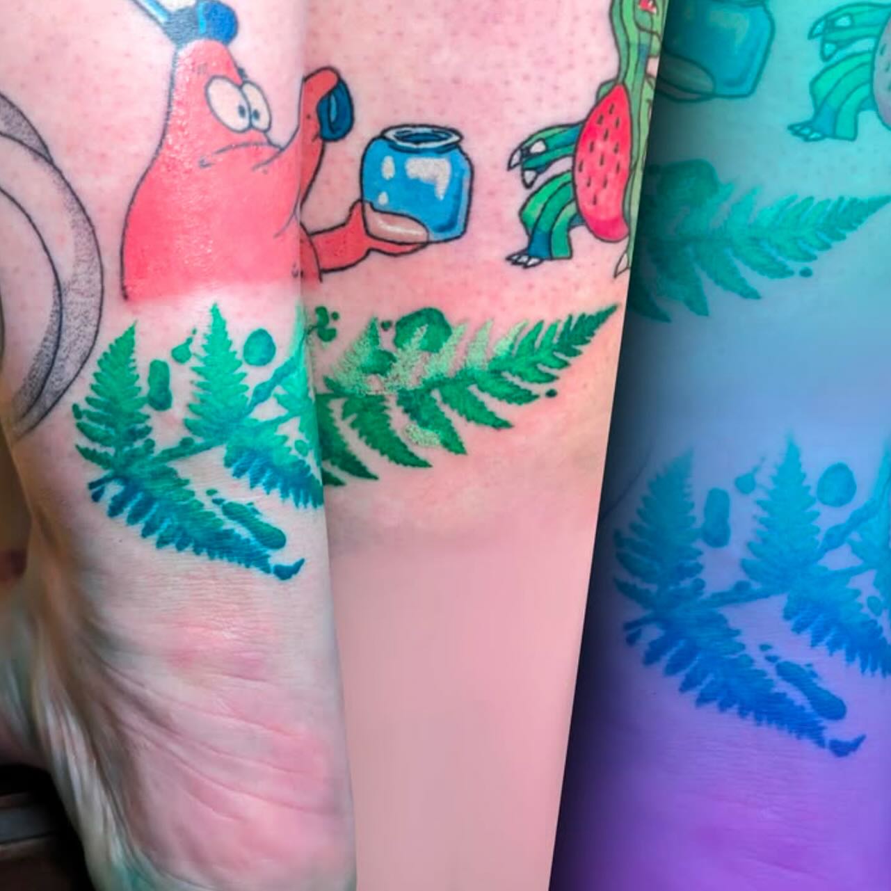 The tattoo features a vibrant green fern, prominently displayed on the skin with detailed leaf shapes.