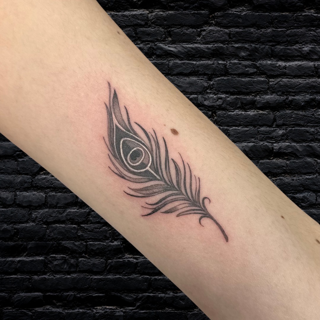 The tattoo features a finely detailed feather with a prominent eye shape nestled within its curve.