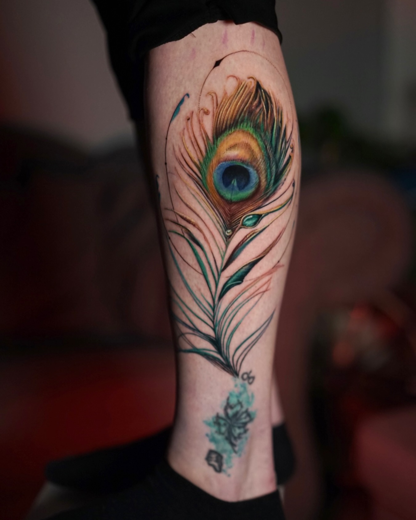 The tattoo features a striking peacock feather with vivid blue and green hues, drawing attention to its intricate details.