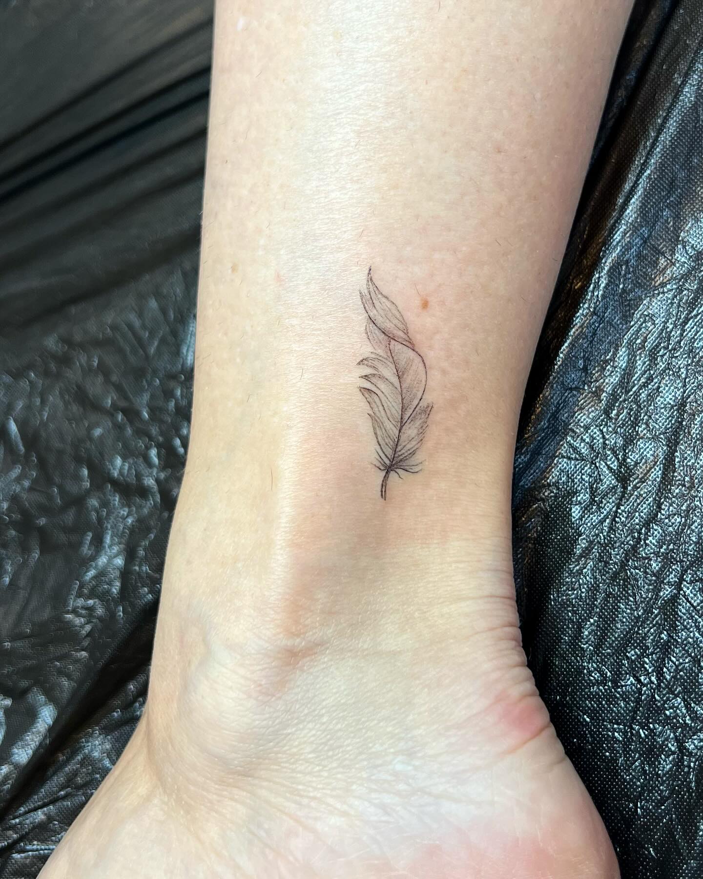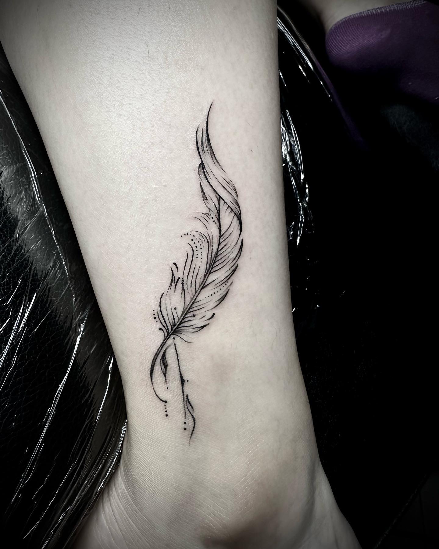 A slender feather tattoo gracefully rests on the ankle, showcasing fine lines and intricate details.