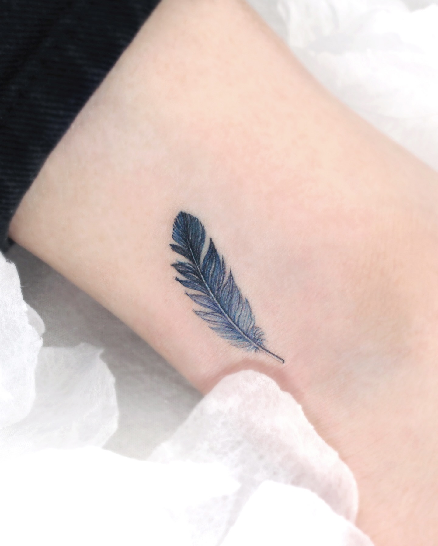 The tattoo features a detailed feather that transitions from dark blue to soft pink, capturing a sense of movement.