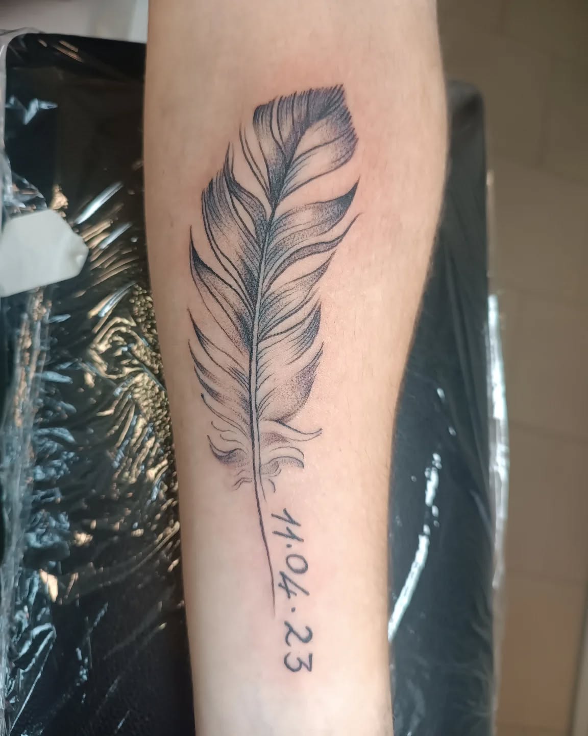 The artist skillfully combines delicate strokes to create a lifelike appearance, with a date elegantly inscribed beneath the feather.