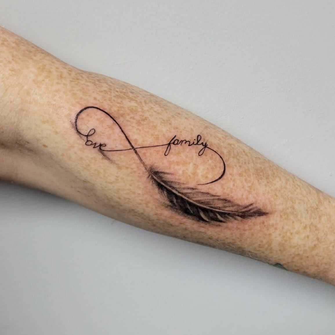 The tattoo features an infinity symbol that elegantly incorporates the words “love” and “family,” with a detailed feather enhancing the design.